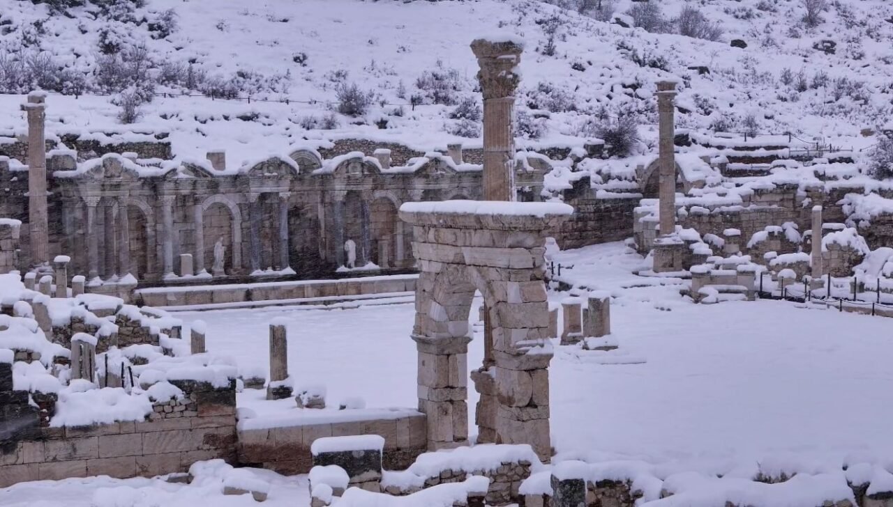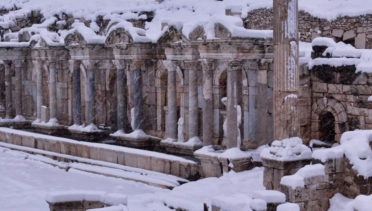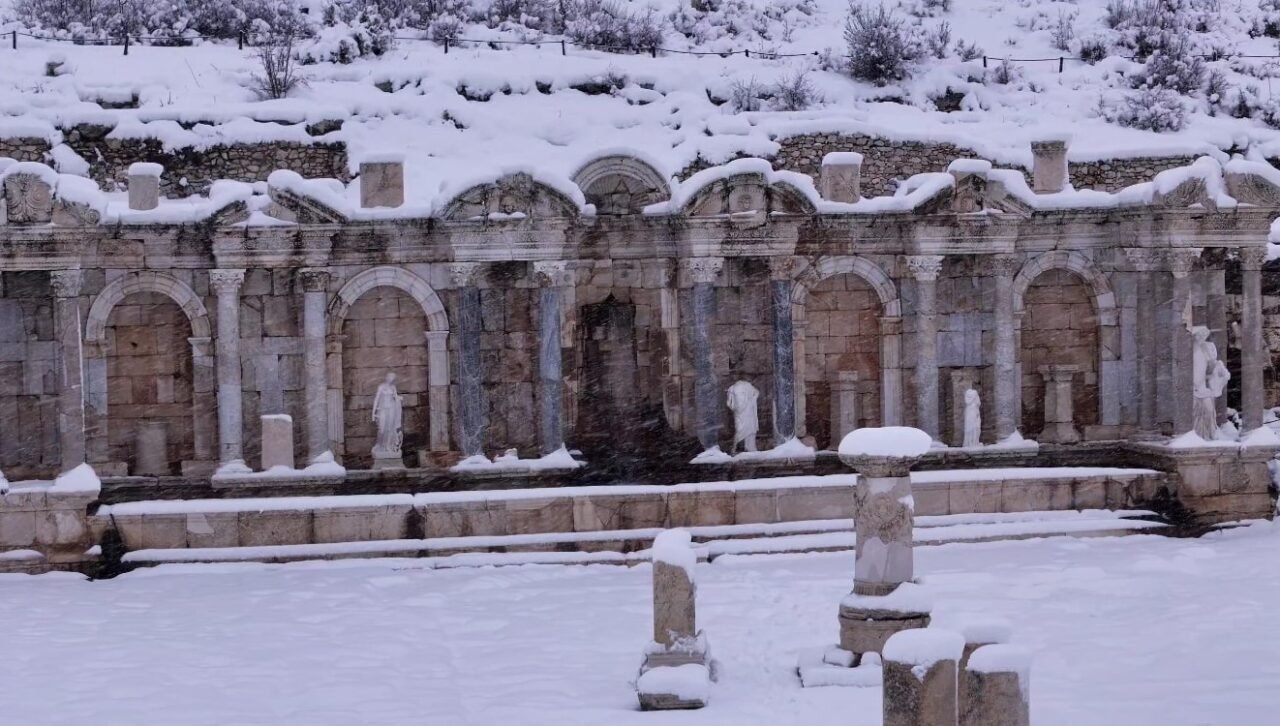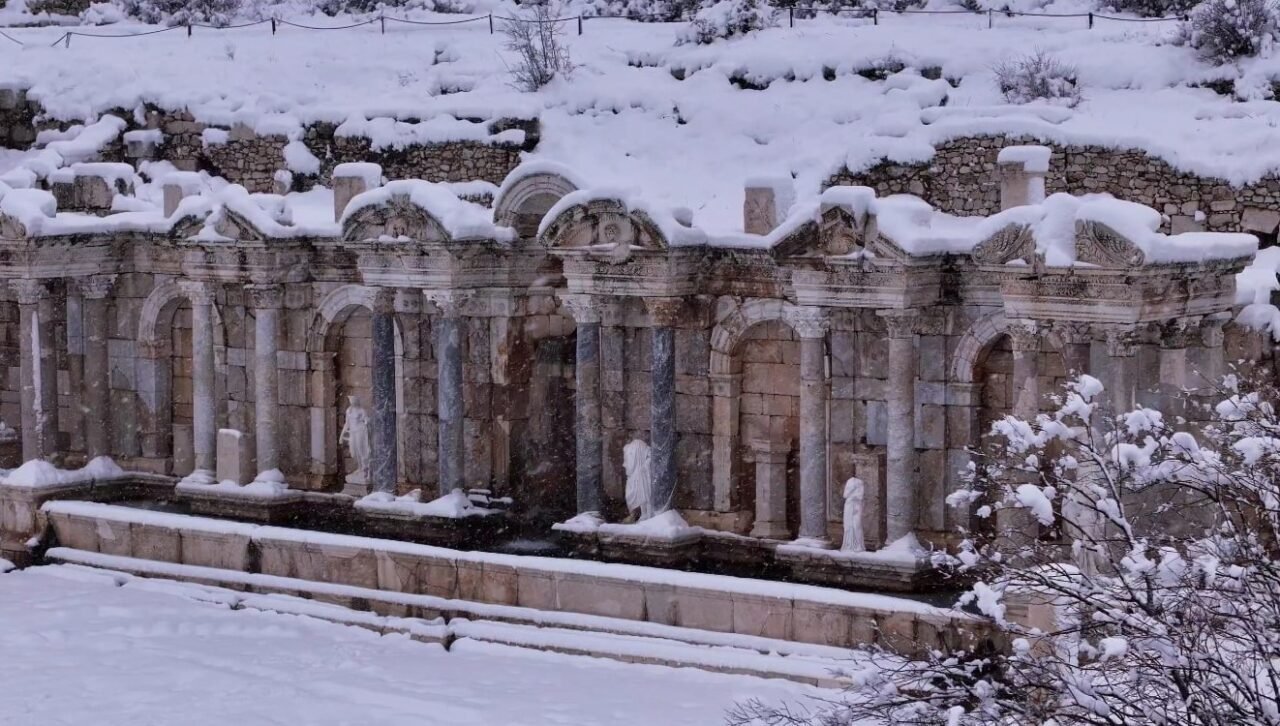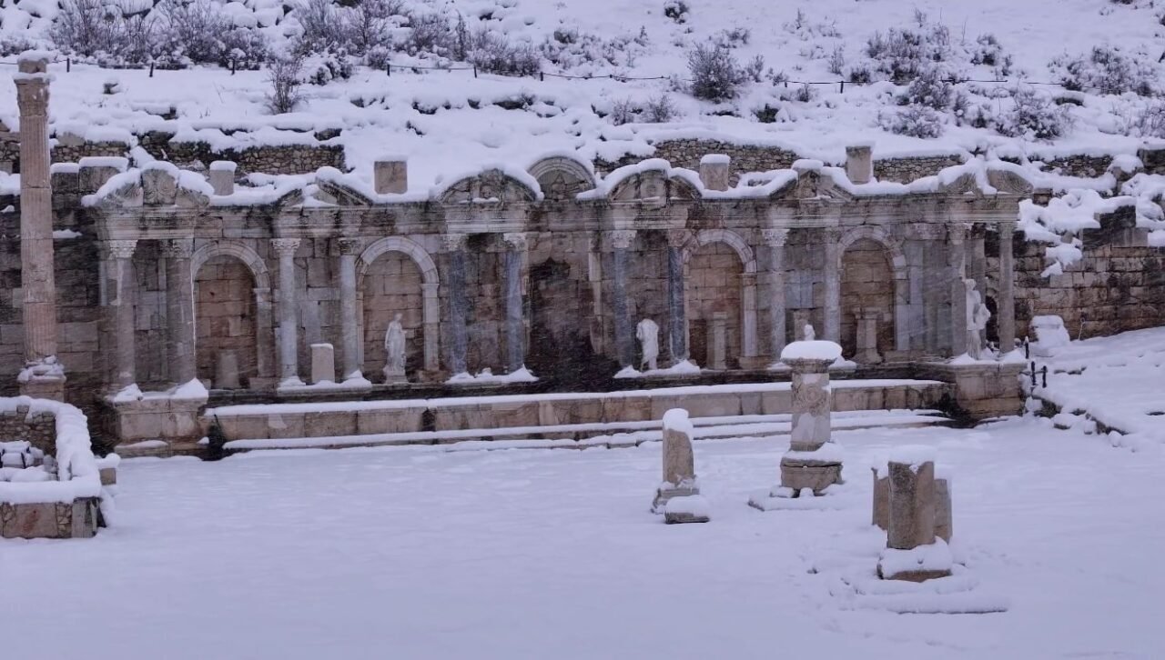 Akdağ eteğinde gizlenen kent yılın dört mevsiminde kendine has yapısıyla adeta görsel şölen oluşturuyor. Yılın son günlerinde bölgeye yağan karın ardından beyaza bürünen antik kent dronla görüntülendi. Antoninler Çeşmesi’nin hiç durmadan akan suyu ve ziyaretçilerine tarihi tekrar yaşatan antik kalıntılarının beyazla uyumu seyir zevki oluşturdu.