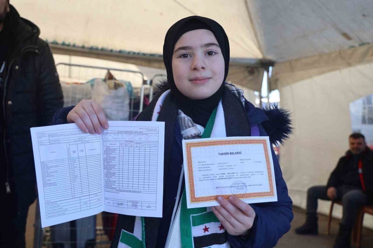 5’inci sınıfta okuyan Sana Hazladi de, “7 yıldır Türkiye’deyim. Ülkeme gideceğim için çok mutluyum ve heyecanlıyım. Ailemle Suriye’ye gideceğiz. Karne olarak takdirname belgesi aldım. Bu yıl okul güzel ve kolay geçti. Öğretmenlerimi ve arkadaşlarımı hepsini özleyeceğim. Benimle arkadaş oldukları ve beni korudukları için hepsine teşekkür ederim. En sevdiğim ders matematikti. Büyüyünce matematik öğretmeni olmak istiyorum. Esad kaçtığı için çok mutluyum. Suriye’ye gidip okuluma devam edeceğim. Halep’e gideceğiz. Halep’te sağlam evimiz var” diye konuştu.