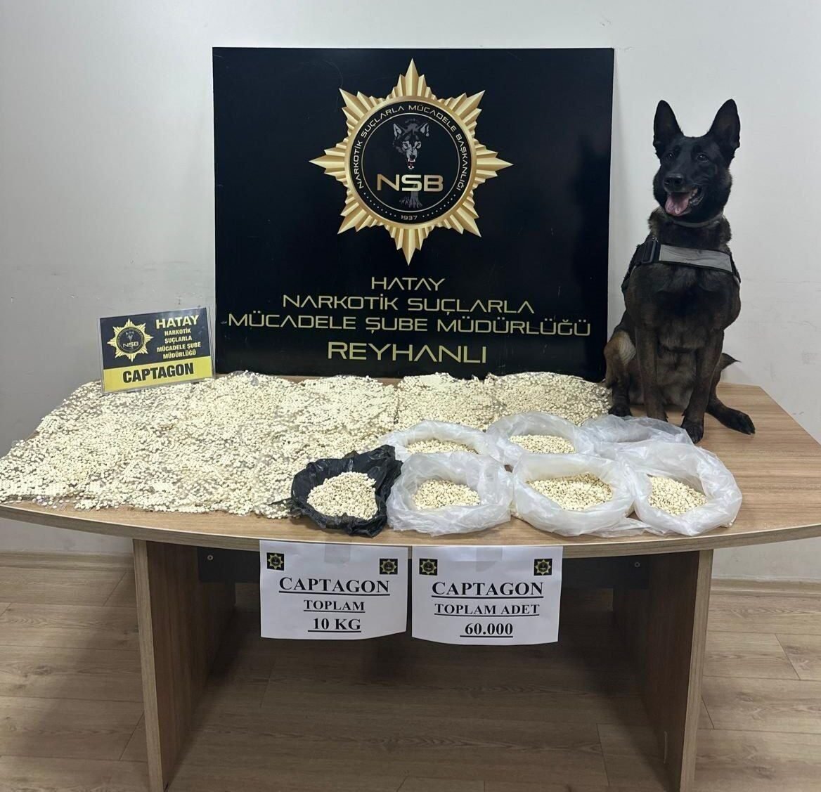 Hatay’da kasa içine saklanmış 10 kilogram ağırlığındaki 60 bin adet captagonu narkotik köpeği ’Alis’ buldu.