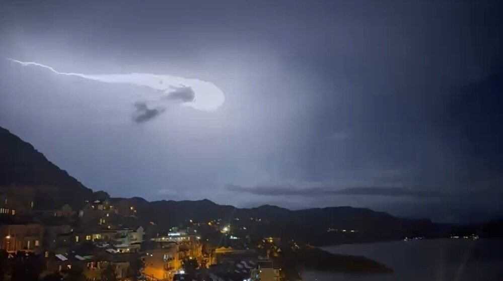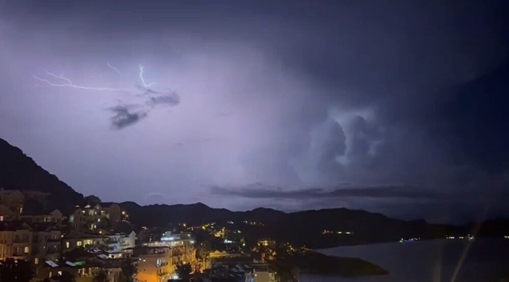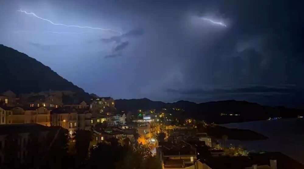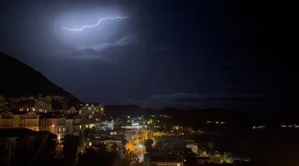 Meteoroloji Genel Müdürlüğü’nün Antalya çevresi için yaptığı kuvvetli yağış ve yıldırım uyarısının ardından Kaş ilçesinde çakan şimşekler gökyüzünü aydınlatarak adeta geceyi gündüze çevirdi.