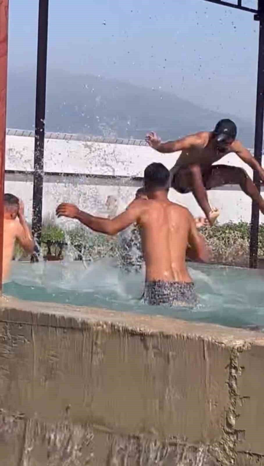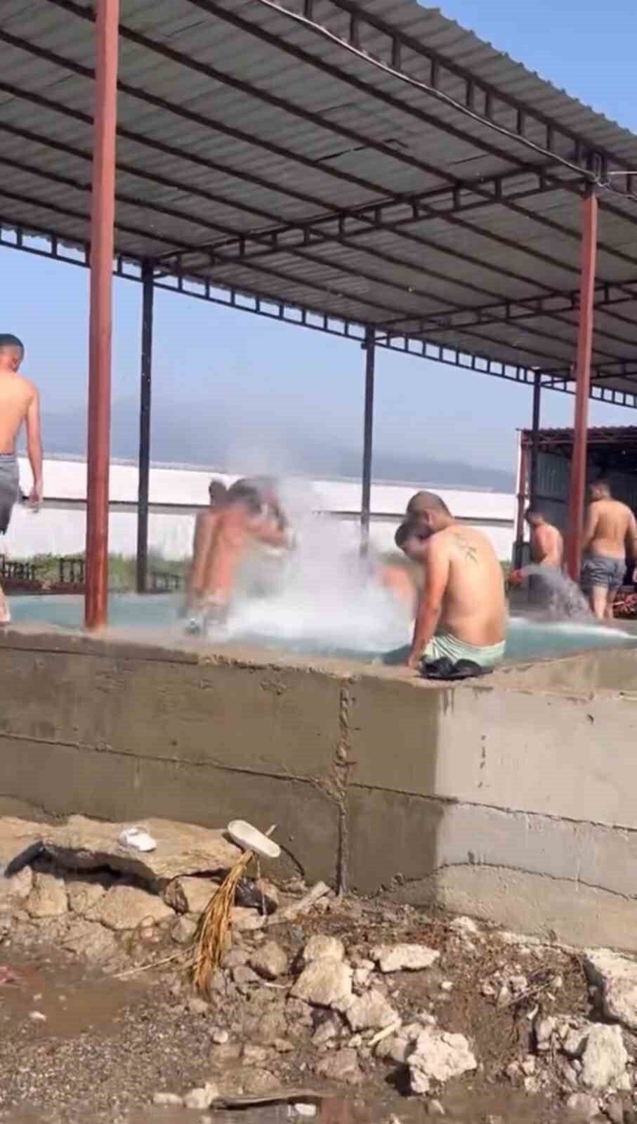 Hatay’da sıcak havanın 45 derecenin üzerine çıkmasıyla bunalan tarım işçileri, maydanoz havuzunda serinledi. Türkiye genelinde etkili olan sıcak hava Hatay’da 45 derecenin üzerine çıktı. Sıcak havada tarım arazilerinde çalışarak ekmek parasını kazanan tarım işçileriyse zor anlar yaşadılar. Arsuz ilçesi Karahüseyinli Mahallesi’nde bölgedeki akarsuda yer alan maydanoz havuzuna giren tarım işçileri, kavurucu sıcakta serinlemenin tadını çıkardılar.