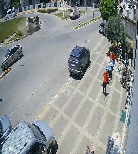 Manavgat ilçesi Aşağı Pazarcı Mahallesi Fevzipaşa Caddesi’nde meydana gelen kazada, Atatürk Caddesi istikametine seyir halindeki Hasan B.B.’nin kullandığı 07 BJV 454 plakalı Peugeot marka hafif ticari araç, Suphi D.’nin kullandığı 06 CUM 466 plakalı otomobil ile çarpıştı. Güvenlik kamerasına saniye saniyesine yansıyan kazada, hafif ticari araç, çarpışmanın şiddetiyle sol tarafına devrilirken, kaldırıma çarptıktan sonra tekerlerinin üzerine geri düştüğü görüldü.