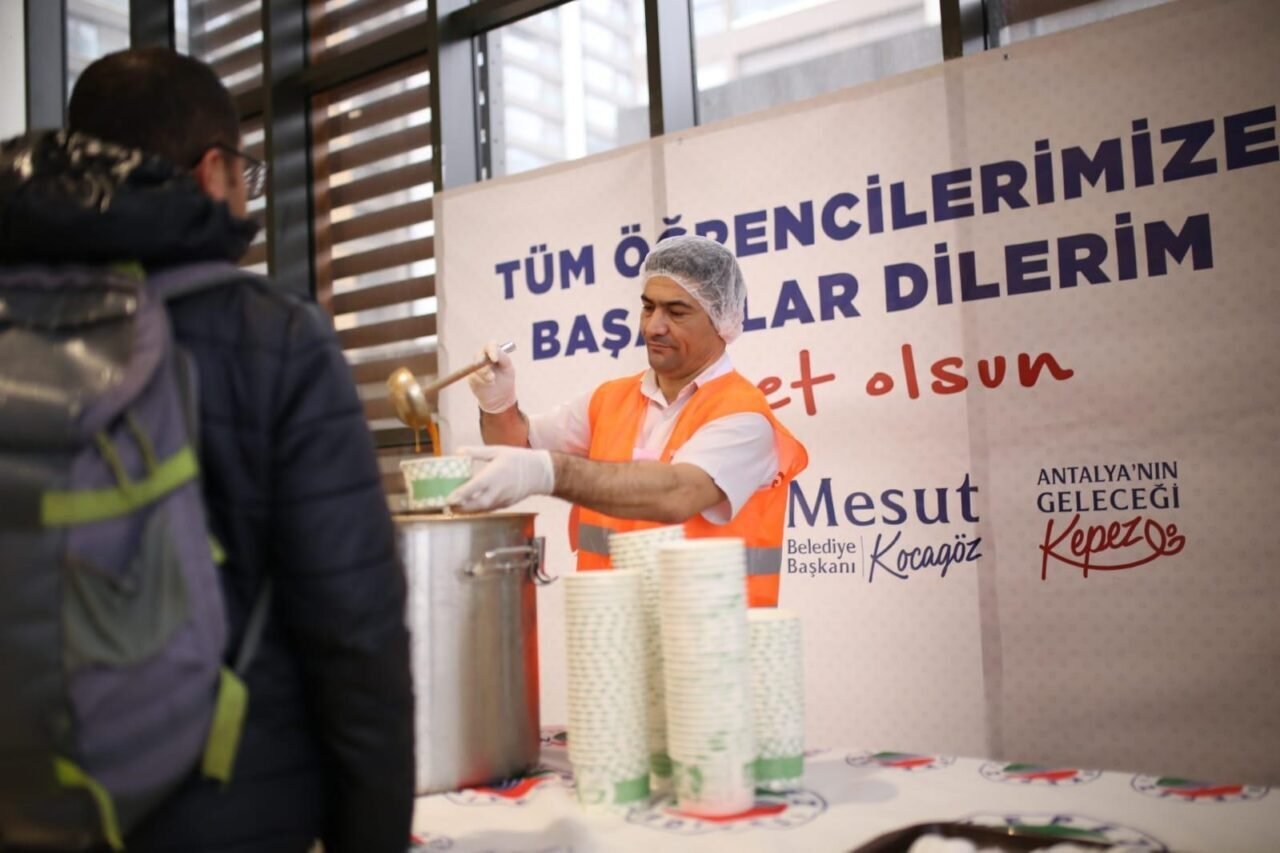 Kepez Belediyesi, yoğun sınav temposundaki öğrencilere destek olmak amacıyla Antalya Kütüphanesi ve Akdeniz Üniversitesi Merkez Kütüphanesi önünde 09.00 ile 10.30 saatleri arasında sıcak çorba ikram ediyor.