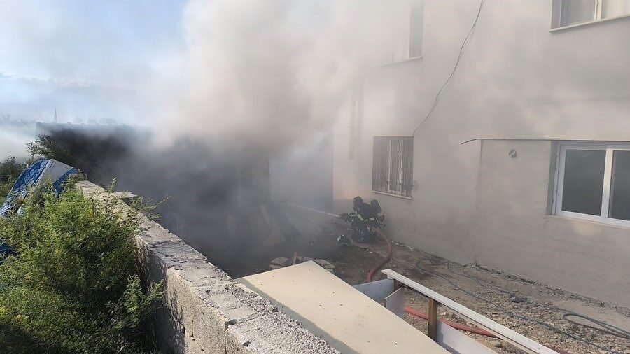 Hatay’da odunlukta çıkan yangında tüpler patlamadan çıkarıldı.