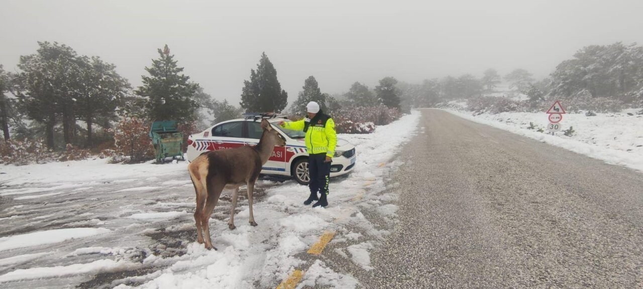Eşeler Yaylası’na salınan kızıl geyiklerden biri, Yeşilova ilçesindeki Salda Kayak Merkezi yakınlarında karla mücadele çalışması yürüten jandarma trafik ekiplerinin yanına kadar yaklaştı. O anlar renkli görüntülere sahne olurken, ekipler bu beklenmedik ziyaret karşısında hayvanın sakinliğine hayran kaldı.