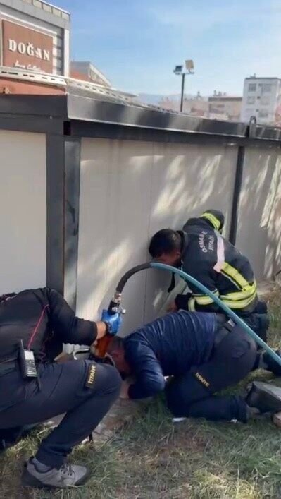 Osmaniye’de konteyner ile duvar arasına sıkışan yavru kedi, itfaiye ekiplerince kurtarıldı.