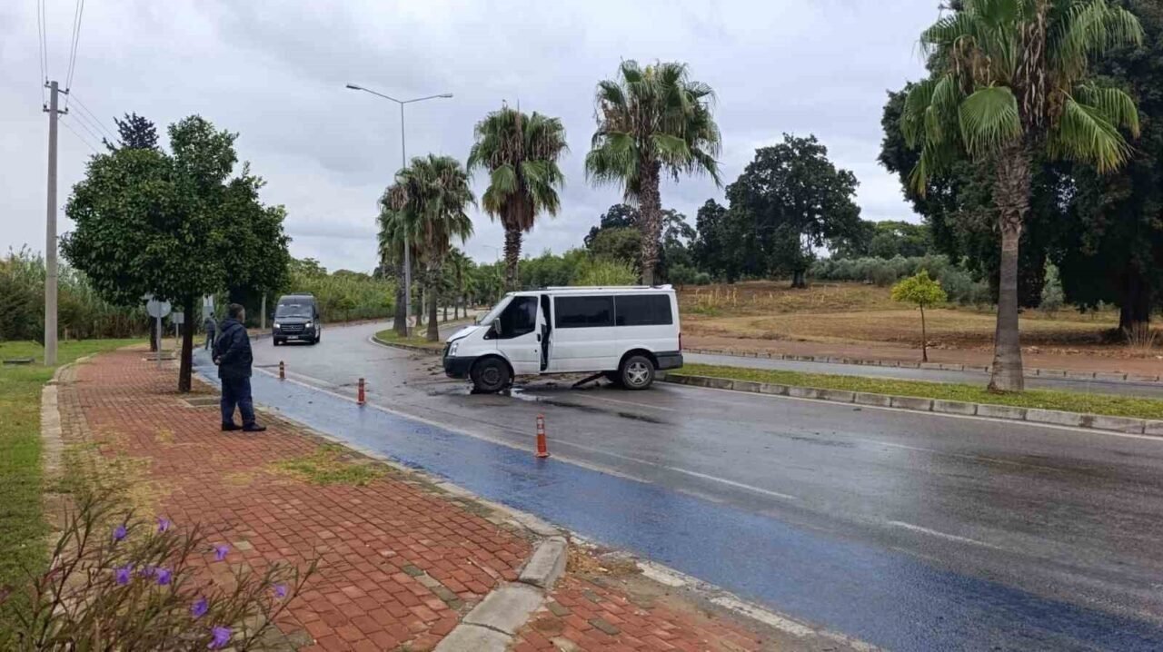 Antalya’nın Manavgat ilçesinde yağmur nedeniyle kayganlaşan yolda sürücüsünün direksiyon hakimiyetini