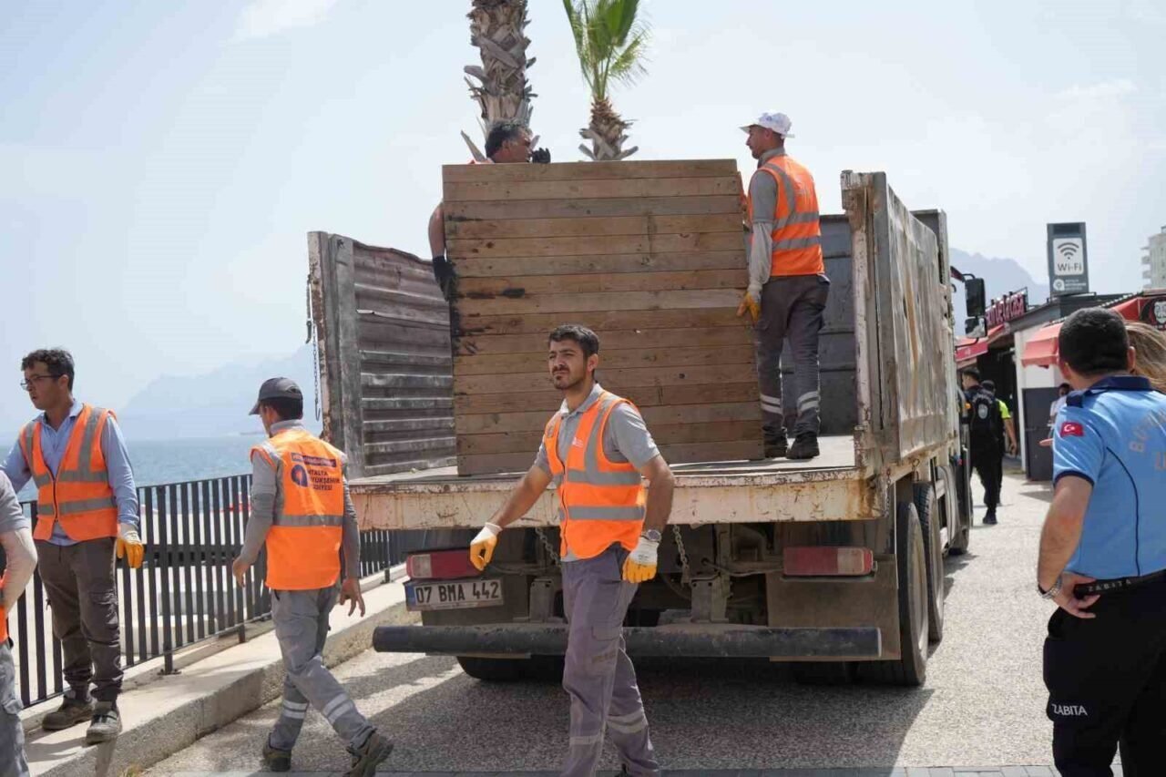 Antalya Büyükşehir Belediyesi, Konyaaltı Sahili’nde kıyı şeridinin halka açık kalması amacıyla başlattığı denetim ve müdahalelere devam ediyor. Sahil şeridinde Kıyı Kanunu ve Konyaaltı Sahili Alan Yönetimi Usul Esasları Yönetmeliği’ne aykırı olarak işletmeler tarafından oluşturulan yapıların kaldırılmasına yönelik daha önce Antalya Valiliği tarafından alınan karar doğrultusunda, belediye ekipleri 5 Mayıs akşamına kadar işletmelere süre tanımıştı.