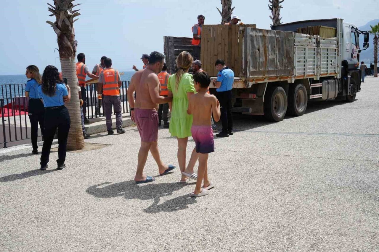 Sürenin dolmasının ardından, 28 No’lu plajda başlatılan yeni denetimlerde zabıta ve çevre koruma ekipleri kaçak yapıların sökümüne başladı. Ekipler, sahil bandına inşa edilen ve denizle vatandaş arasında fiziksel engel oluşturan ahşap platformları yerinden sökerek kamyonlara yükledi.