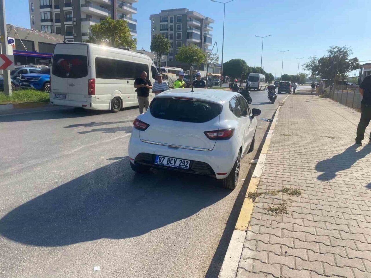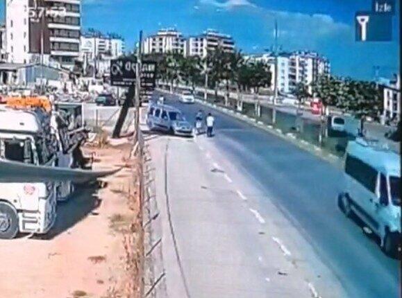 Antalya’nın Serik ilçesinde yoldan karşıya geçmeye çalışan baba ve kucağına aldığı 12 yaşındaki oğluna otomobilin çarptığı kazada 1’i ağır 2 kişi yaralandı. Kaza anı güvenlik kamerasına yansıdı.