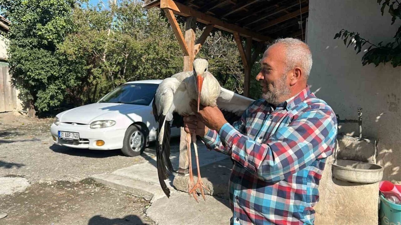 Hatay’da bir vatandaş evinin bahçesinde bulduğu leyleği, kümeste balıkla besleyerek koruma altına aldı.