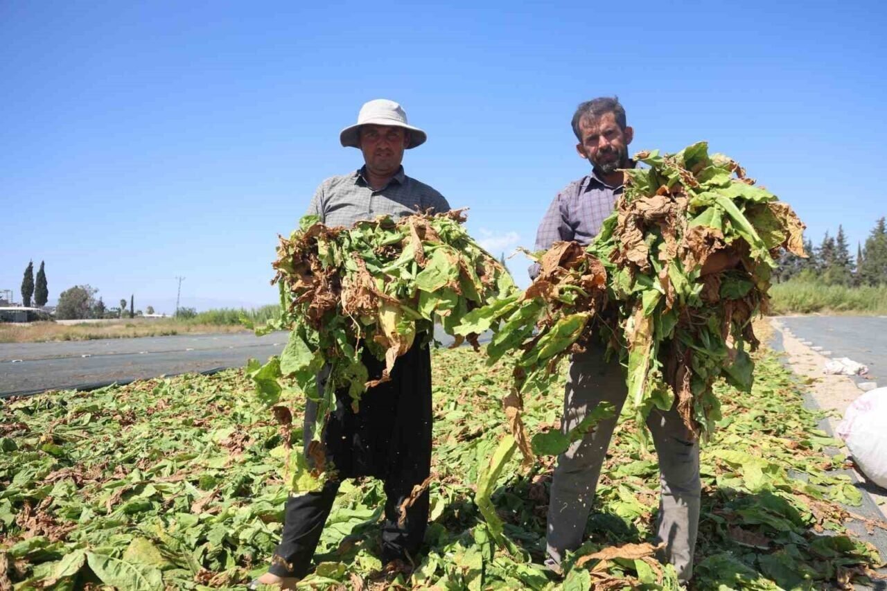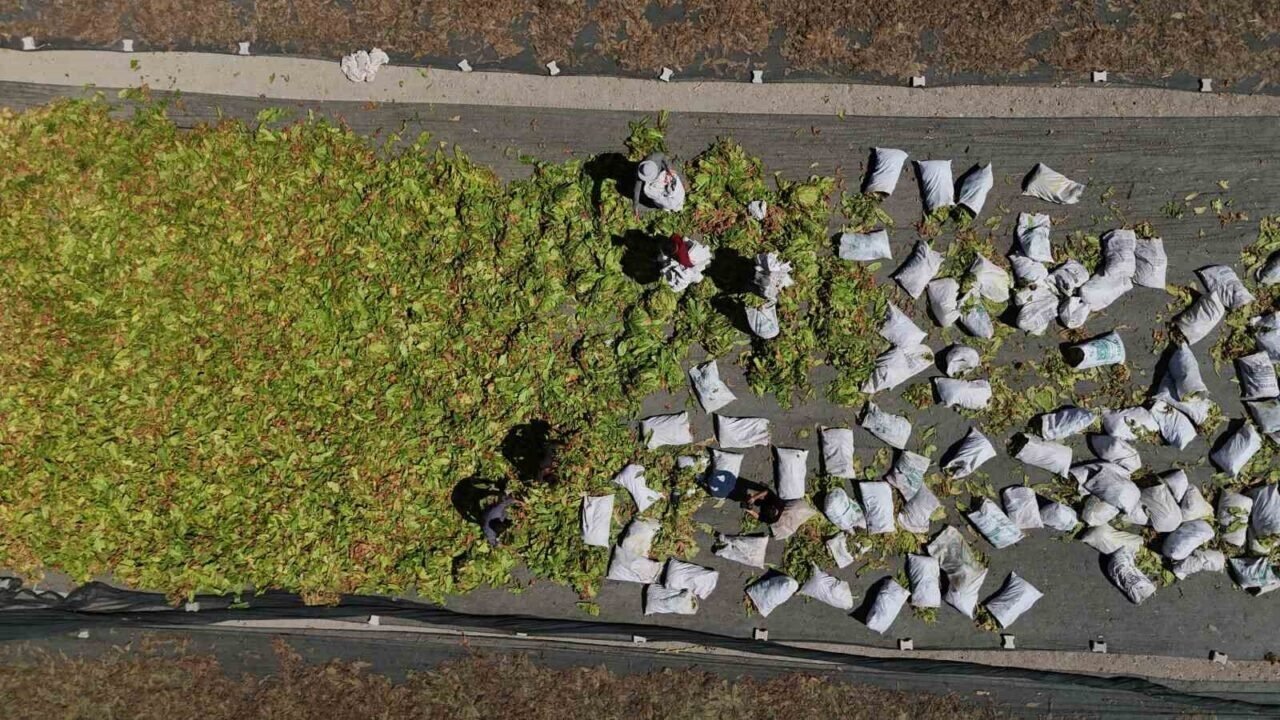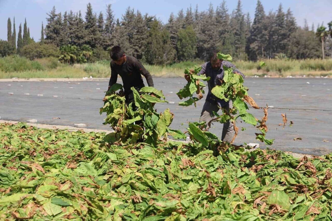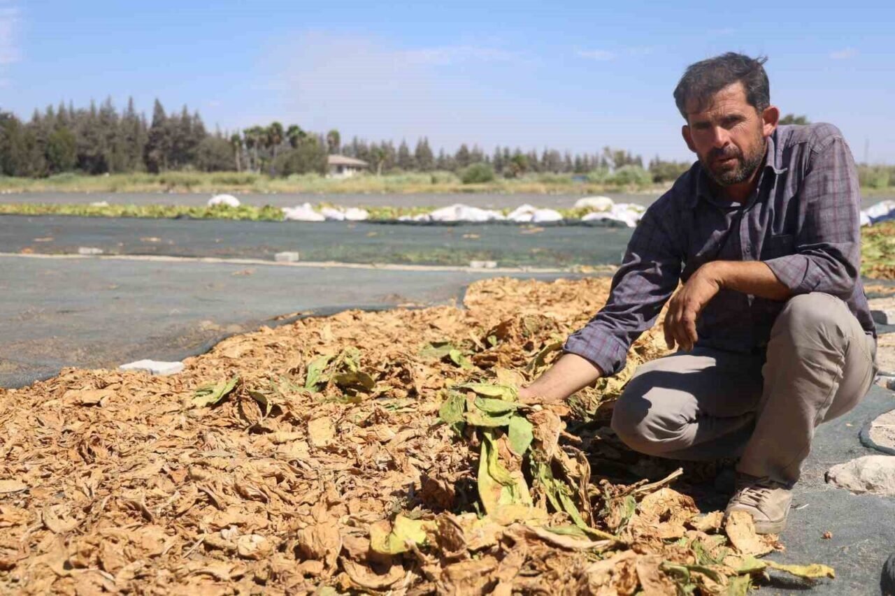 Hava sıcaklıklarının mevsim normallerinin üzerinde ilerlediği Hatay’da tütünde hasat devam ediyor. Tarlada zor şartlarda toplanan ve açık arazide kurutulmaya bırakılan tütün için çiftçilerin ve işçilerin zorlu mesaisi sürüyor. Antakya ilçesi Demirköprü Mahallesi’nde hasat edilen tütünün kurutulmaya bırakıldığı araziyse adeta renklendi. Çiftçi Cuma Yılmaz, kurutulmuş tütünün kilogram fiyatının tarladan 165 TL’den satıldığını söyledi.