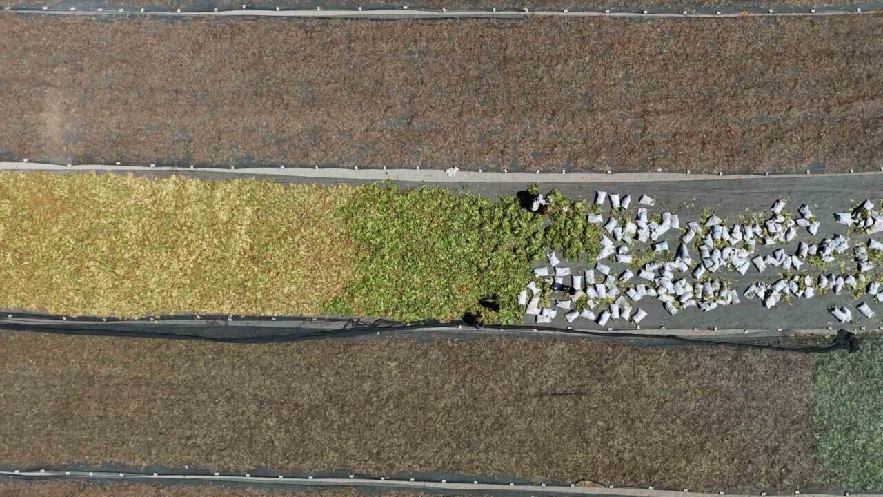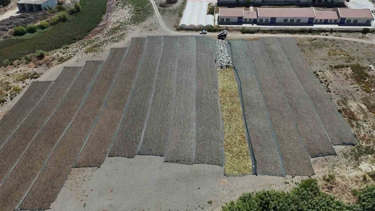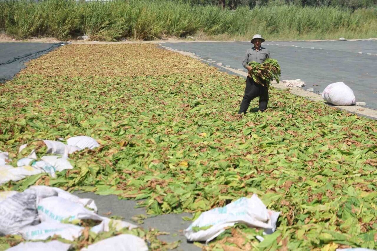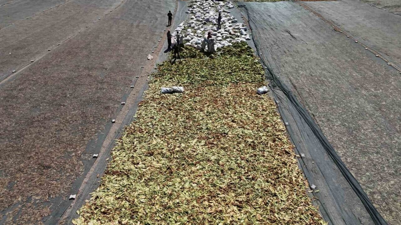 Hava sıcaklıklarının mevsim normallerinin üzerinde ilerlediği Hatay’da tütünde hasat devam ediyor. Tarlada zor şartlarda toplanan ve açık arazide kurutulmaya bırakılan tütün için çiftçilerin ve işçilerin zorlu mesaisi sürüyor. Antakya ilçesi Demirköprü Mahallesi’nde hasat edilen tütünün kurutulmaya bırakıldığı araziyse adeta renklendi. Çiftçi Cuma Yılmaz, kurutulmuş tütünün kilogram fiyatının tarladan 165 TL’den satıldığını söyledi.