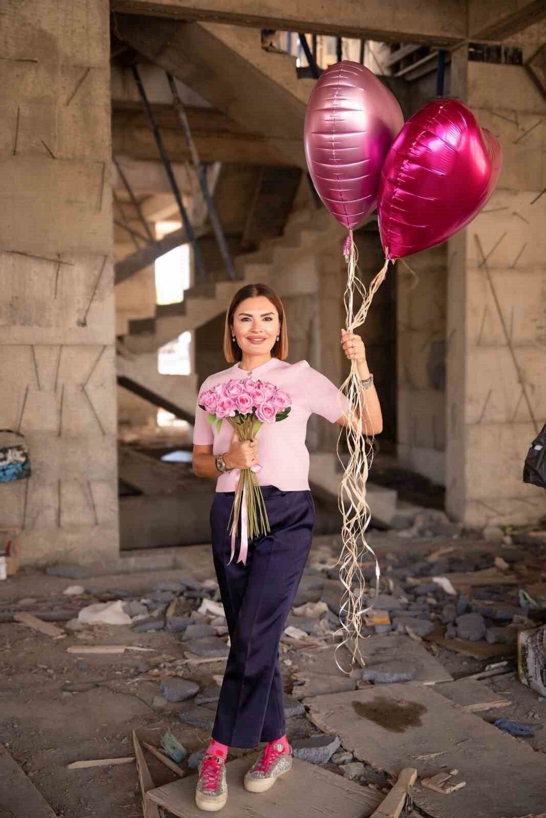 Şantiyede işçileri ve balonlarla fotoğrafı çekildi