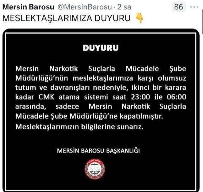 Baronun resmi sosyal medya hesabından yapılan açıklamada, “Mersin Narkotik Suçlarla Şube Müdürlüğünün meslaktaşlarımıza karşı olumsuz tutum ve davranışlar nedeniyle ikinci bir karara kadar CMK atama sistemi saat: 23.00 ile 06.00 arasında sadece Mersin Narkotik Suçlarla Mücadele Şube Müdürlüğü’ne kapatılmıştır. Meslektaşlarımızın bilgilerine sunarız” denildi.