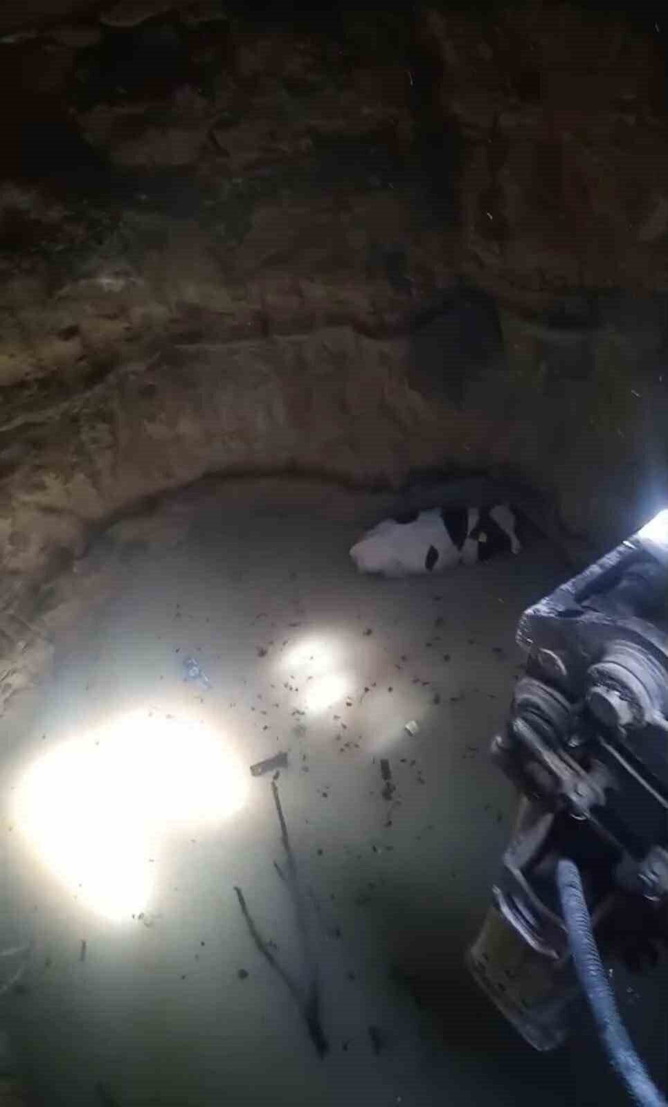 Titiz bir çalışmanın ardından iş makinesine halat yardımıyla bağlanan dana kuyudan çıkarılarak sahibine teslim edildi.