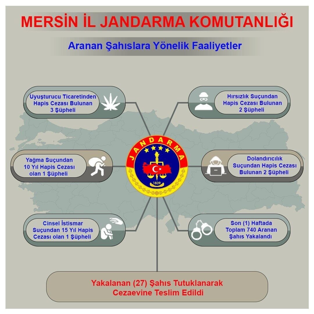 Edinilen bilgiye göre, İl Jandarma Komutanlığı ekipleri kesinleşmiş hapis cezası bulunan şahısların yakalanmasına yönelik çalışma yaptı. Ekiplerine son bir haftada düzenlediği operasyonlarda, aralarında 10 ila 17 yıl arasında değişen hapis cezası alan 9 kişinin de bulunduğu toplam 740 şahıs yakalandı. Yakalananların 27’si sevk edildikleri mahkemece tutuklandı.