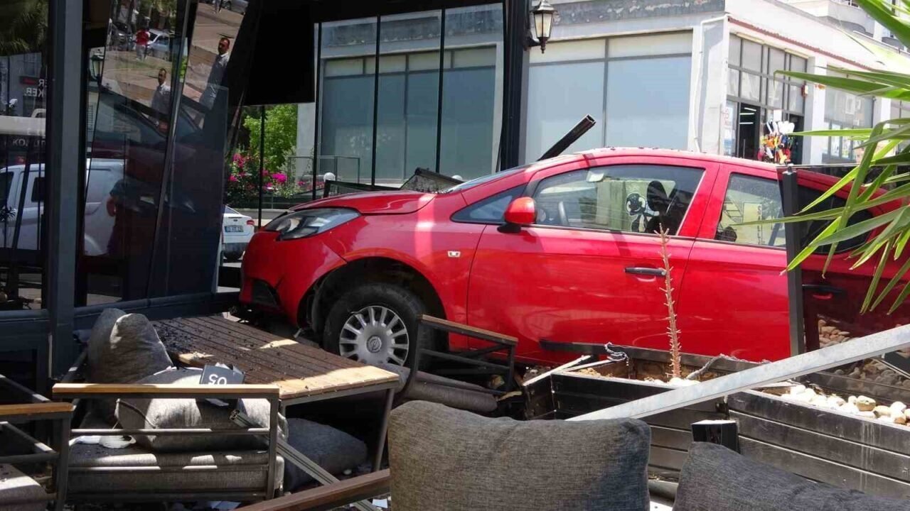 Mersin’de dönüş yapmak isteyen kadın sürücü, sağ tarafındaki motosikletliyi sıkıştırmamak için geniş manevra yapınca kontrolünü kaybederek aracıyla birlikte bir kafeye daldı.