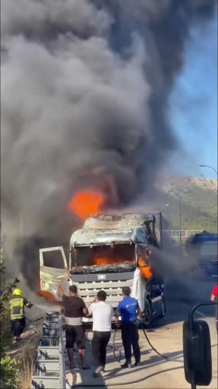 Mersin’de seyir helindeki tırda yangın çıktı, alevlere itfaiye ve orman ekipleri müdahale etti.
