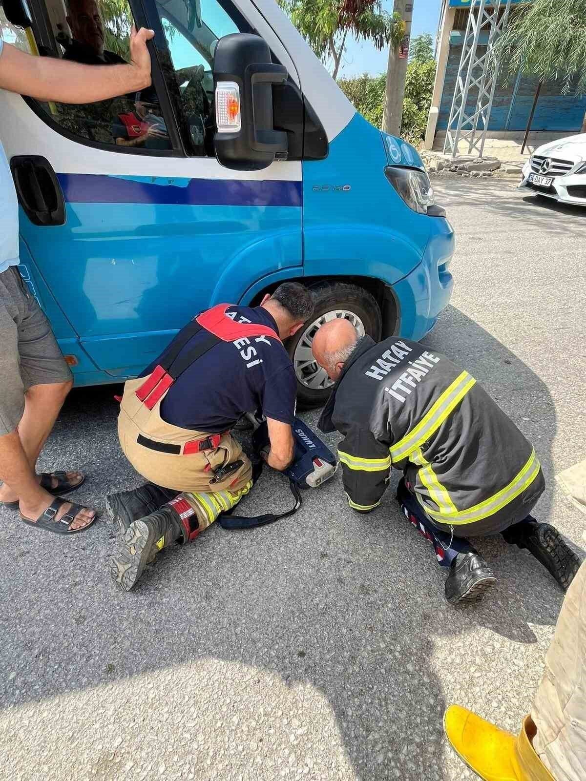 Samandağ ilçesi Kurtderesi Mahallesi’nde bulunan bir köpek, minibüsün altına girdi. Minibüs şoförü, aracı çalıştırdığı esnada aracın altından ses geldiğini fark etti. Aracın altına baktığında köpeğin sıkıştığını gören şoför, hayvanı kendi imkanlarıyla çıkartamayınca 112 Acil Çağrı Merkezi’ne bildirildi. İhbar üzerine olay yerine Hatay Büyükşehir Belediyesi’ne bağlı itfaiye ekipleri sevk edildi. Kısa sürede bölgeye intikal eden itfaiye ekiplerinin müdahalesiyle köpek kurtarıldı. Kurtarılan hayvan, doğaya bırakıldı.