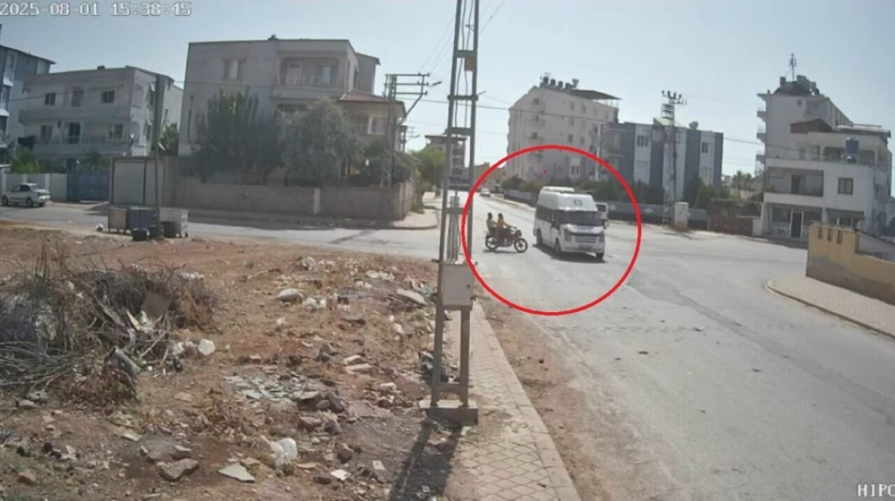 Hatay’da motosikletin, minibüsle çarpışmasıyla 2 kişinin yere savrulduğu anlar kameraya yansıdı.