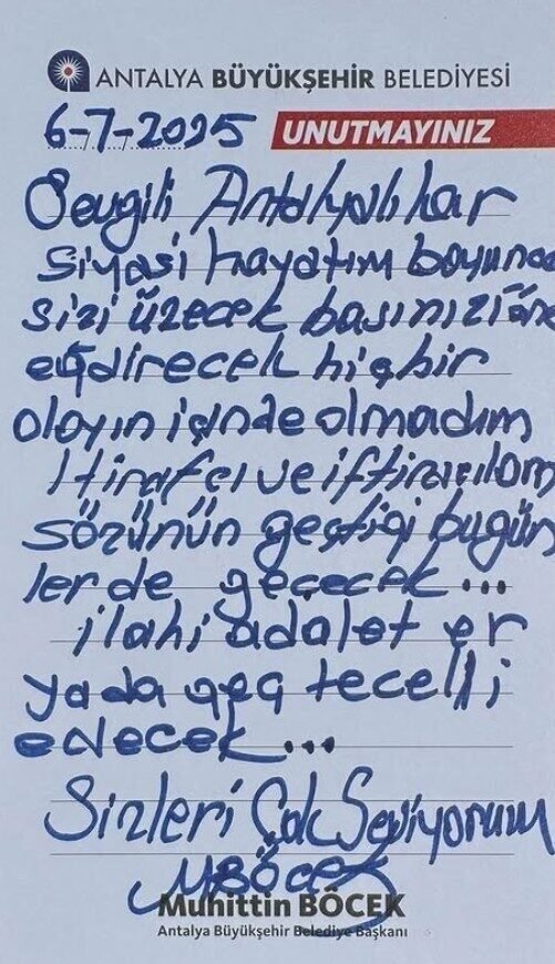 Antalya’da yürütülen rüşvet soruşturması kapsamında tutuklanan Antalya Büyükşehir Belediye Başkanı Muhittin Böcek’in, sosyal medya hesabından bir mesajı paylaşıldı. Böcek, “Siyasi hayatım boyunca sizi üzecek, başınızı öne eğdirecek hiçbir olayın içinde olmadım. İtirafçı ve iftiracıların sözünün geçtiği bugünler de geçecek. İlahi adalet er ya da geç tecelli edecek” dedi.