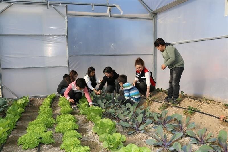 Bahçesine 40 sert çekirdekli meyve fidanı dikilen okuldaki öğrenciler, aynı zamanda 60 metrekare alanda kurulan seraya, öğretmenlerinin gözetiminde marul, brokoli, çilek, kabak, biber ve salatalık fidesi dikti.