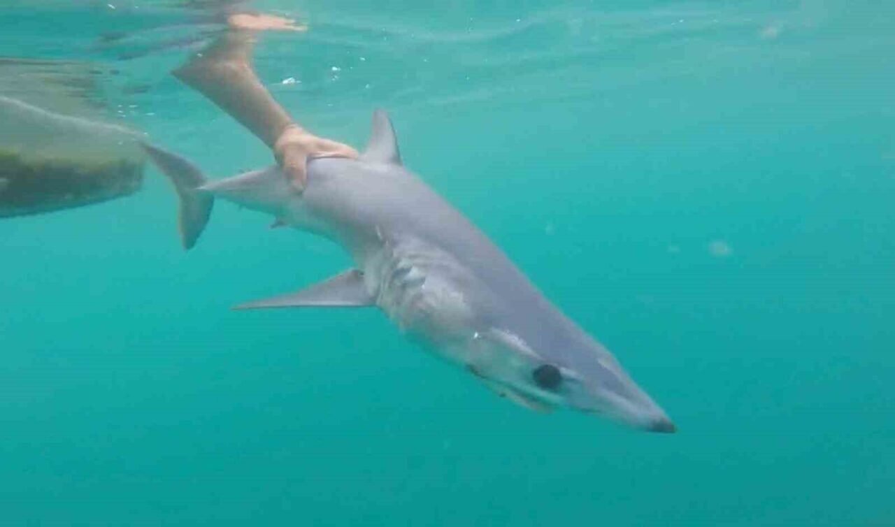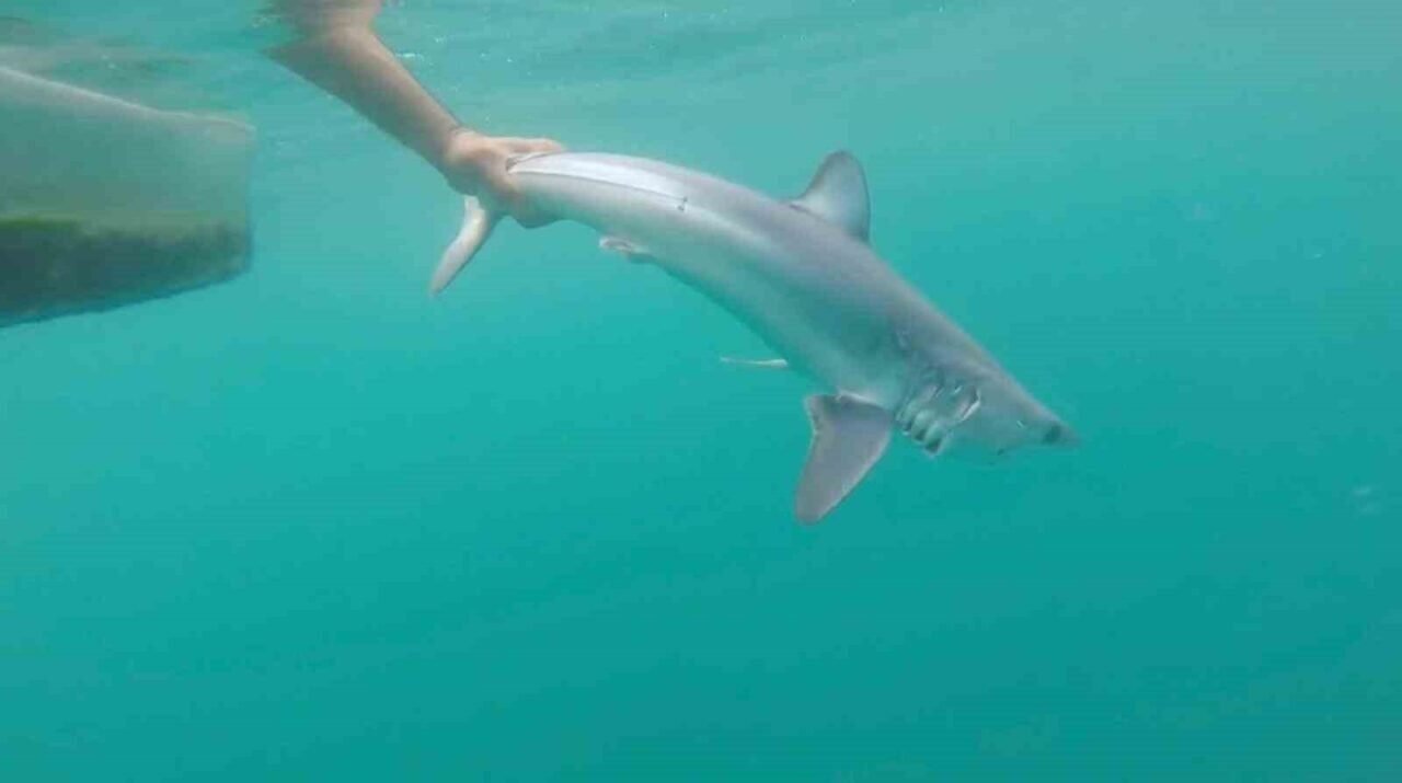 Mersin’de hobi olarak balık avlayan Çınar Küçük, oltasına takılan yaklaşık 120 santimetre boyundaki mako cinsi köpek balığını, yüzgecine takılan olta iğnesini çıkarıp bir süre eliyle tutarak yüzdürdükten sonra denize geri bıraktı. Kayda aldığı o anları sosyal medya hesabından paylaşan Küçük’e bazıları köpek balığını geri bıraktığı için tebrik ederken, bazıları da insanlara zarar vereceği endişesiyle tepki gösterdi.