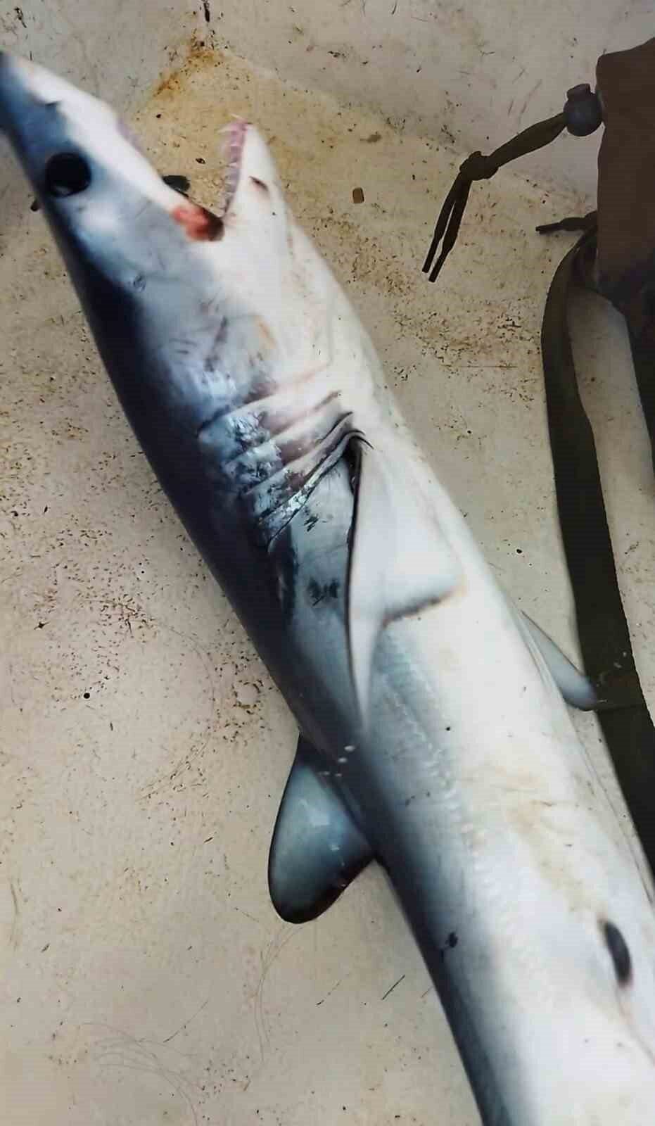 MERSİN’DE HOBİ OLARAK BALIK AVLAYAN ÇINAR KÜÇÜK, OLTASINA TAKILAN YAKLAŞIK 120 SANTİMETRE BOYUNDAKİ YAVRU MAKO KÖPEK BALIĞINI, YÜZGECİNE TAKILAN OLTA İĞNESİNİ ÇIKARIP BİR SÜRE ELİYLE TUTARAK YÜZDÜRDÜKTEN SONRA DENİZE GERİ BIRAKTI.