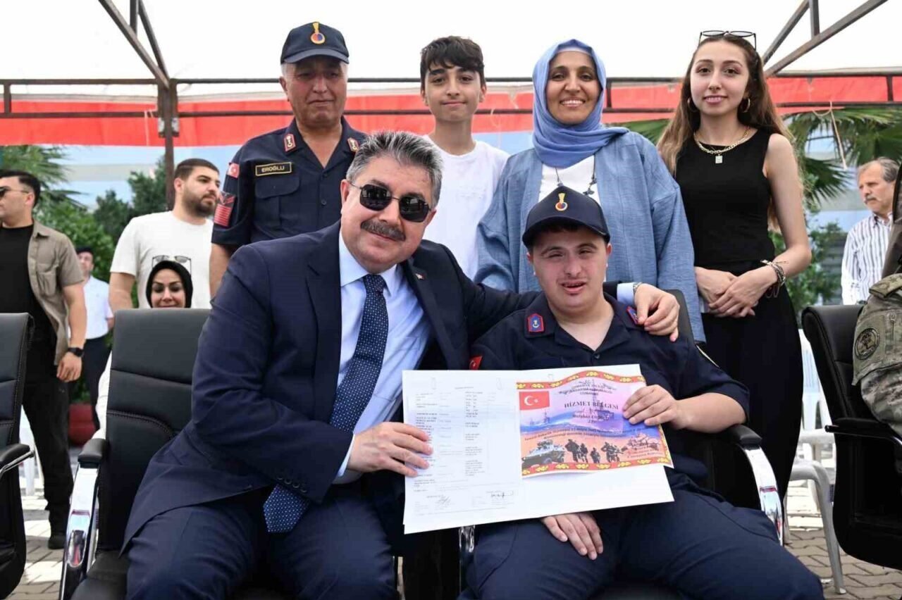 Osmaniye İl Jandarma Komutanlığı tarafından temsili askerlik uygulaması nedeniyle İl Jandarma Komutanlığı’nda tören gerçekleştirildi. Saygı duruşu ve İstiklal Marşı’nın okunmasıyla başlayan törende engelli gençler ellerini Türk bayrağı üzerine koyarak yemin etti. Törende konuşan Osmaniye Valisi Erdinç Yılmaz, “Bugün 26 Mehmetçiğimiz, yürekleri ve inançlarıyla şanlı Türk Ordusu’nun üniformasını giyerek asker oldular. Bu onuru yaşayan evlatlarımızı ve onları yetiştiren anne-babalarını yürekten kutluyorum. Her Türk gencinin bu şerefli orduya mensup olduğunda duyduğu gurur çok büyüktür. Terhislerinin hayırlı olmasını diliyor, uygulamayı gerçekleştiren İl Jandarma Komutanlığımıza teşekkür ediyorum” dedi.