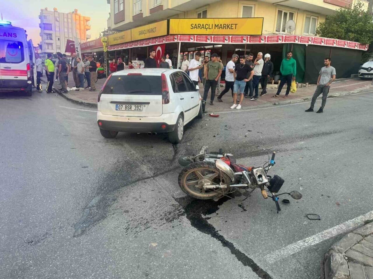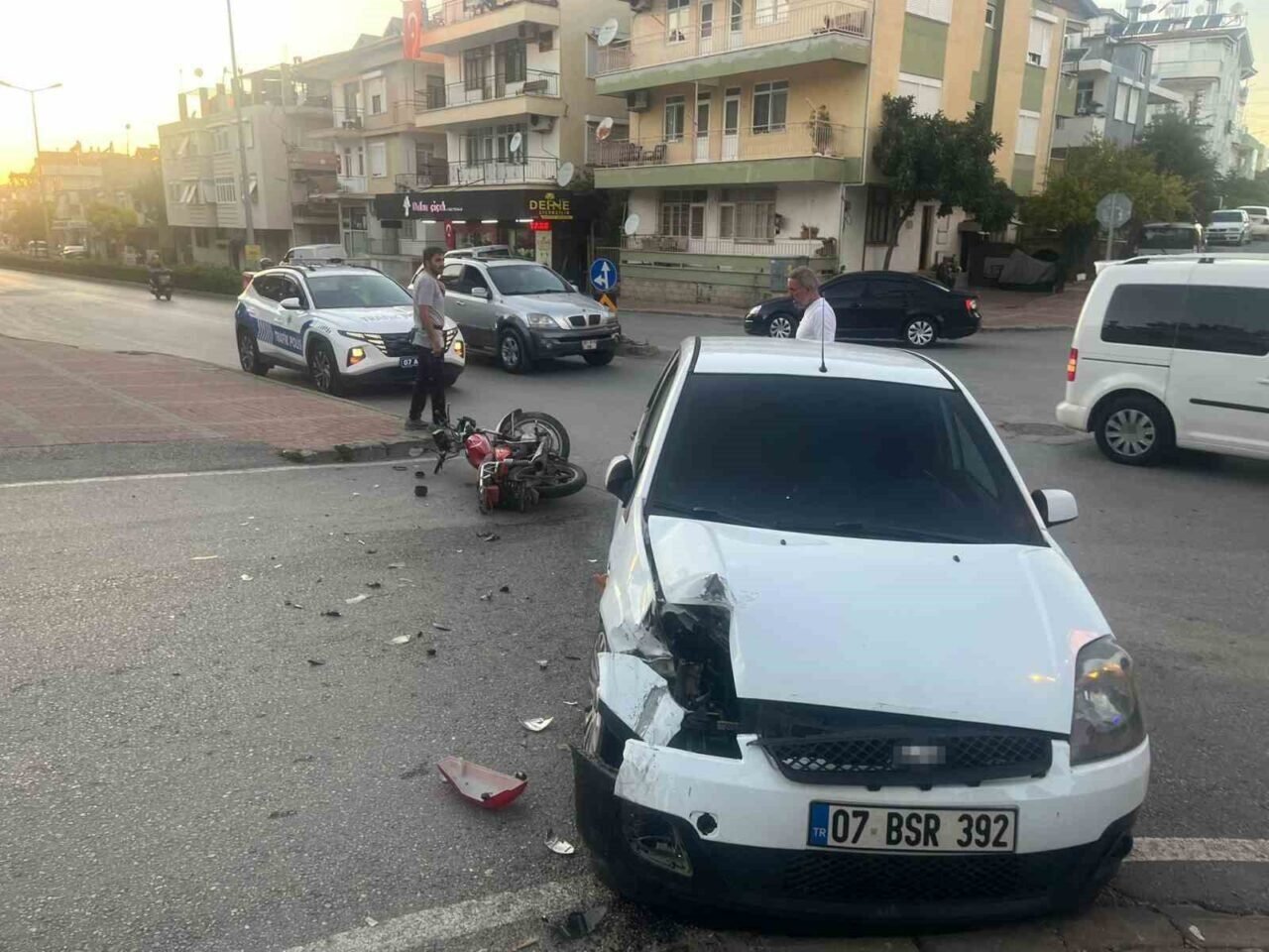 Antalya’nın Manavgat ilçesinde motosiklet ile otomobilin kavşakta çarpışması sonucu meydana gelen kazada yabancı uyruklu motosiklet sürücüsü yaralanırken, motosikletin plakasız ve sürücünün ise ehliyetsiz olduğu, kaskının da bulunmadığı belirlendi. Sürücünün çarpışmanın etkisiyle takla atıp otomobilin diğer tarafına düştüğü anlar güvenlik kamerasına yansıdı.
