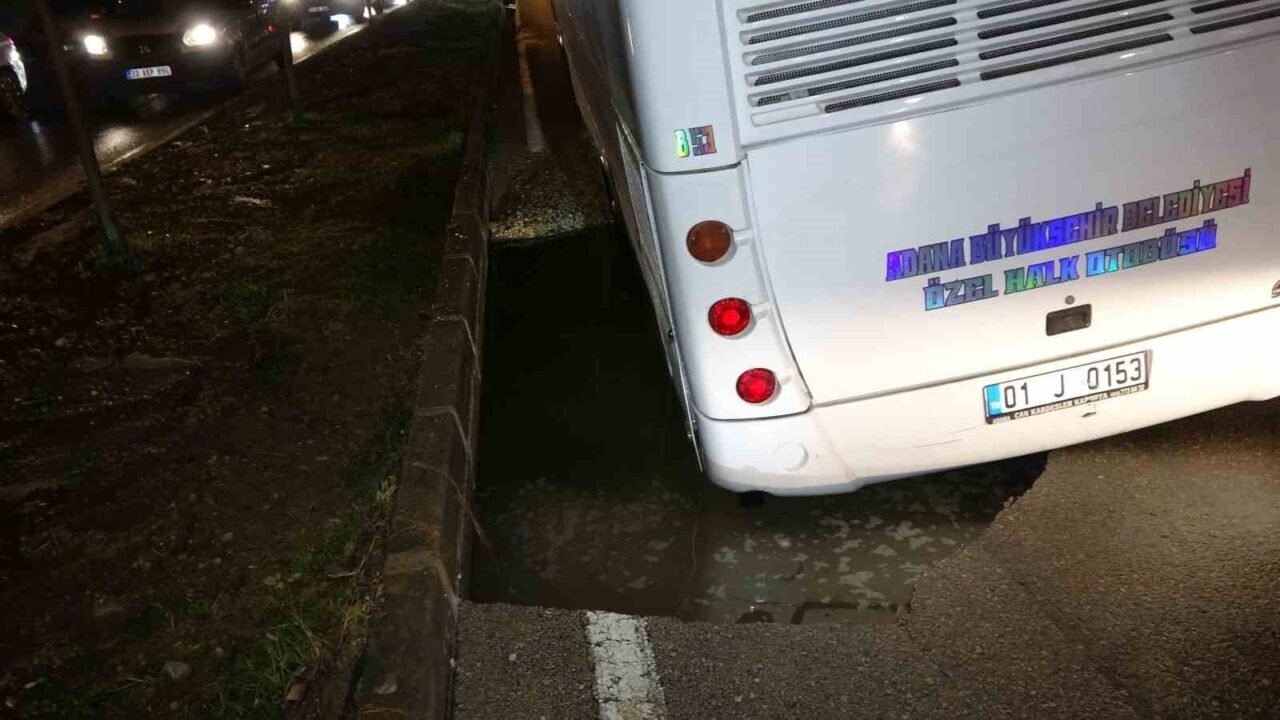 Adana’da içme suyunun patlaması sonucu özel halk otobüsü yolda oluşan çukura düştü. Otobüsün şoförü, “Sanki yer yarıldı içine girdiniz derler ya bildiğin yol yarıldı otobüs içine girdi” dedi.