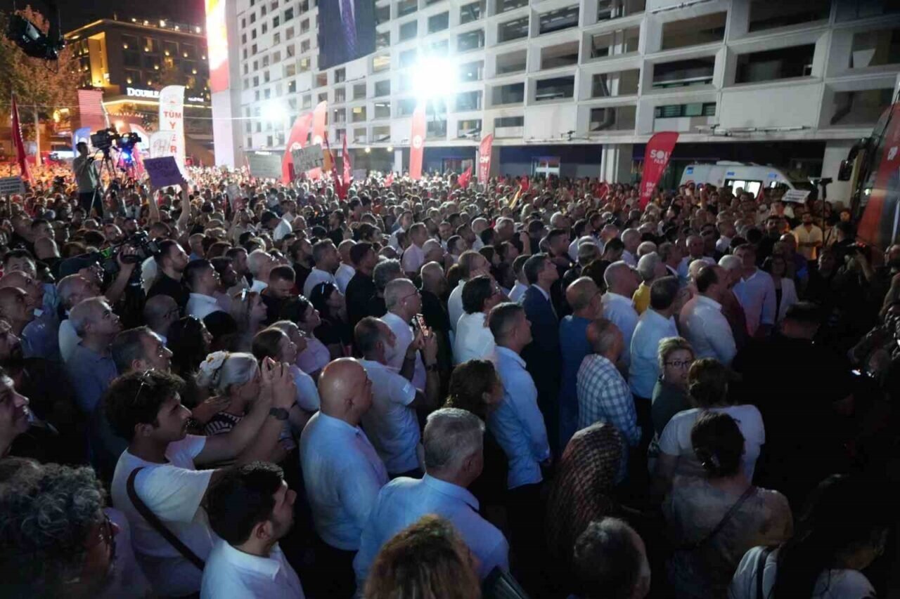 Belediye önündeki kalabalık, ellerinde Türk bayrakları ve parti flamalarıyla alanı doldurdu. Mitingde Özel’e, Büyükşehir Belediye Başkan Vekili Büşra Özdemir ile Başkan Böcek’in abisi ve yengesi de eşlik etti.