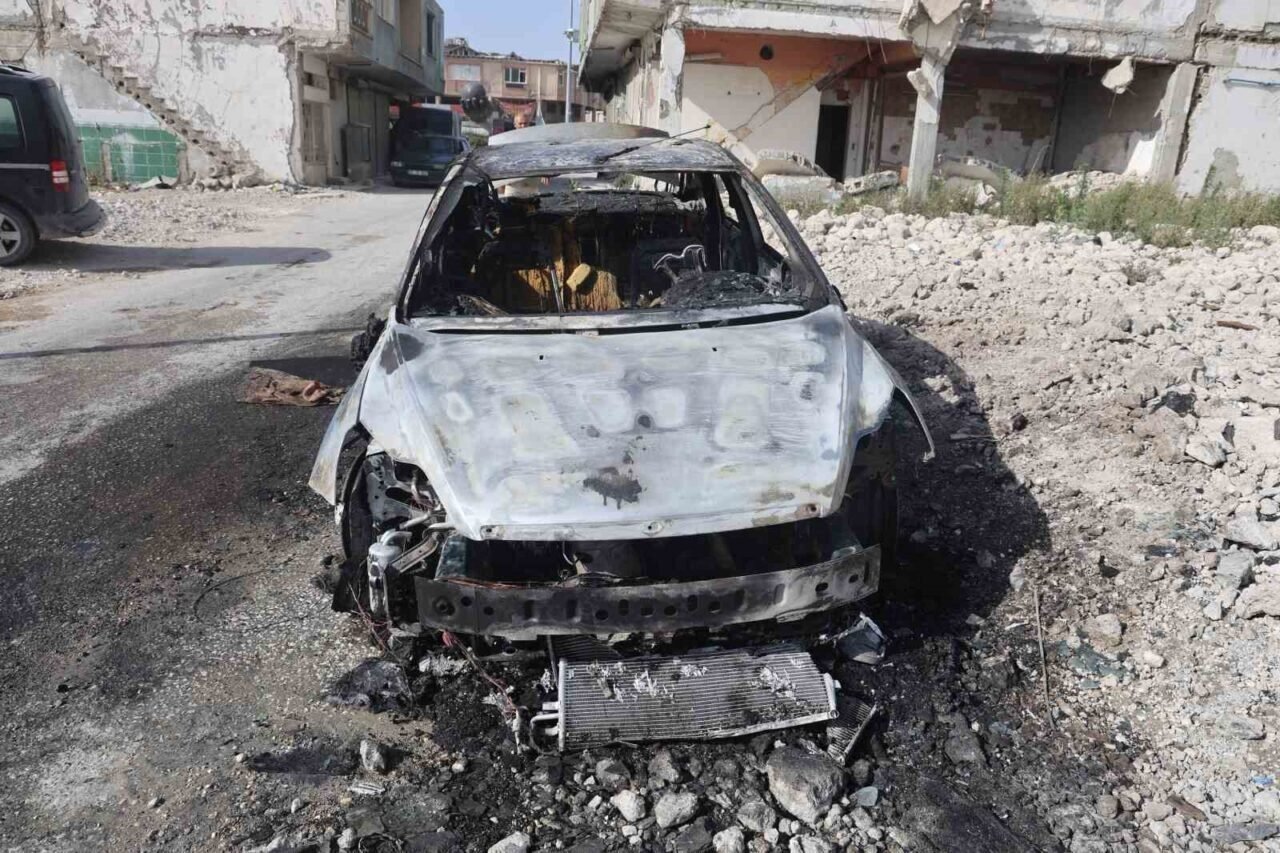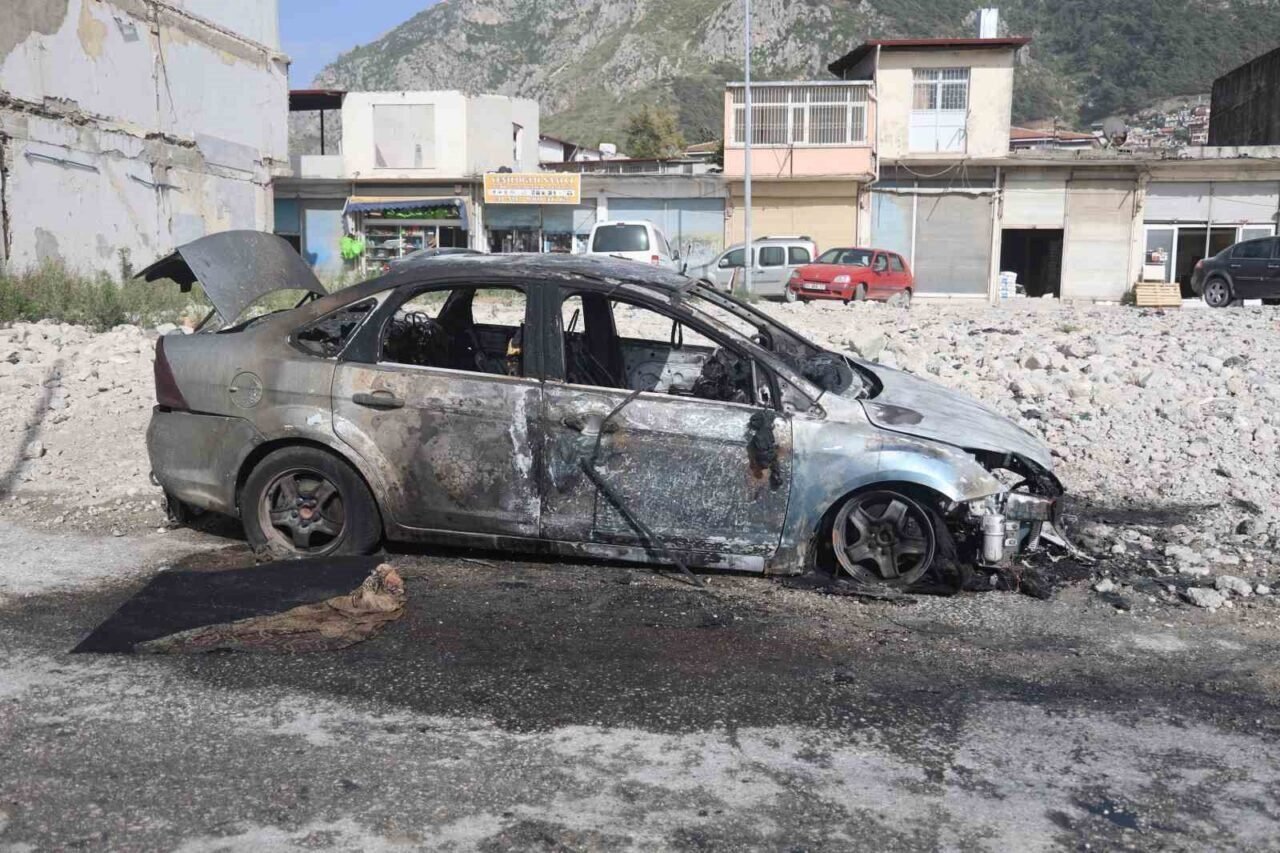Hatay’ın Antakya ilçesinde park halindeyken yanan otomobil kullanılamaz hale geldi.