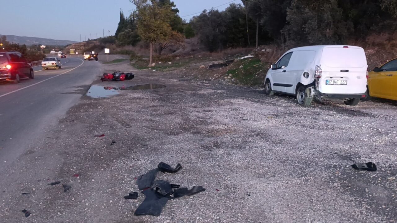 Antalya’nın Manavgat ilçesinde motosiklet, yol kenarında park halindeki hafif ticari araca çarptı. Kazada motosiklet sürücüsü yaralanırken, yola savrulan parçalara çarpmamak için manevra yapan iki otomobil de maddi hasarlı kazaya karıştı.