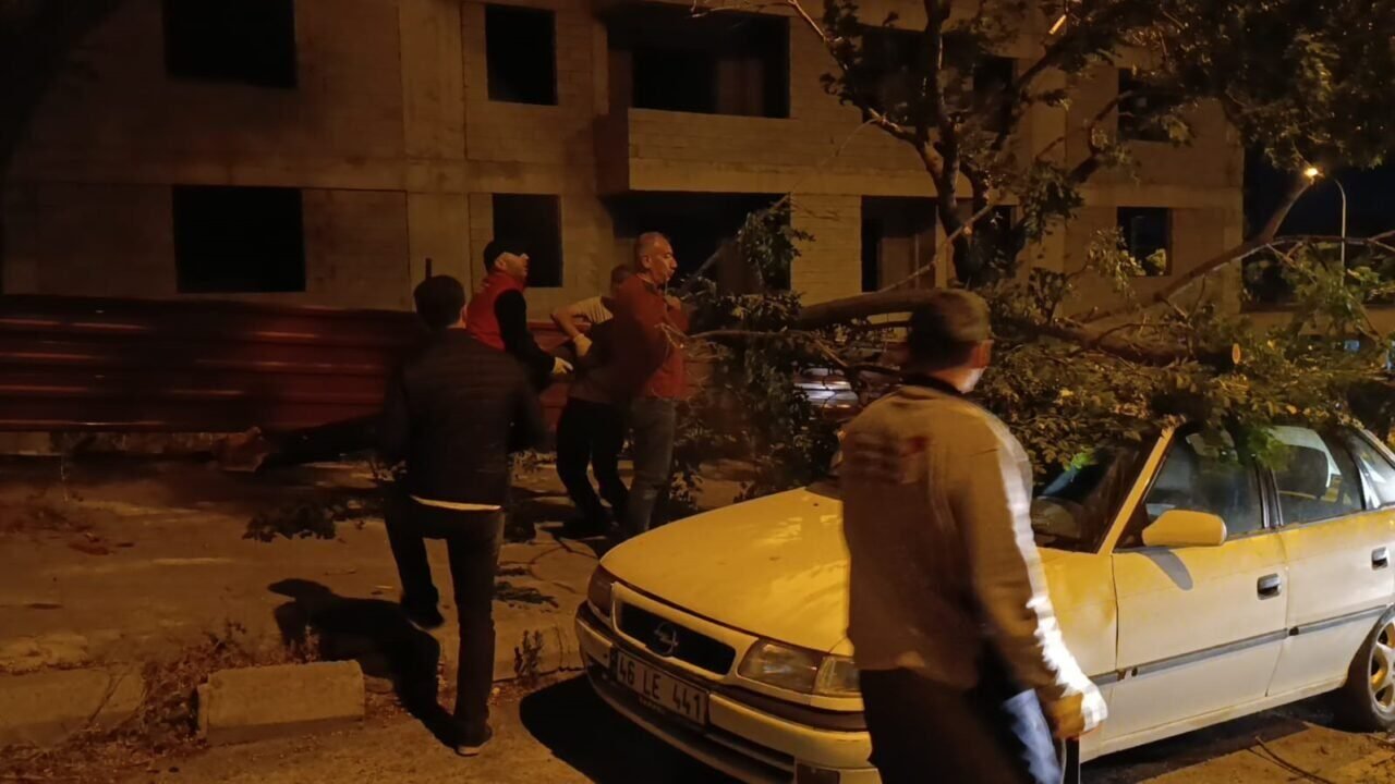 Kahramanmaraş’ta etkili olan fırtına nedeniyle park halindeki otomobilin üzerine ağaç devrildi.