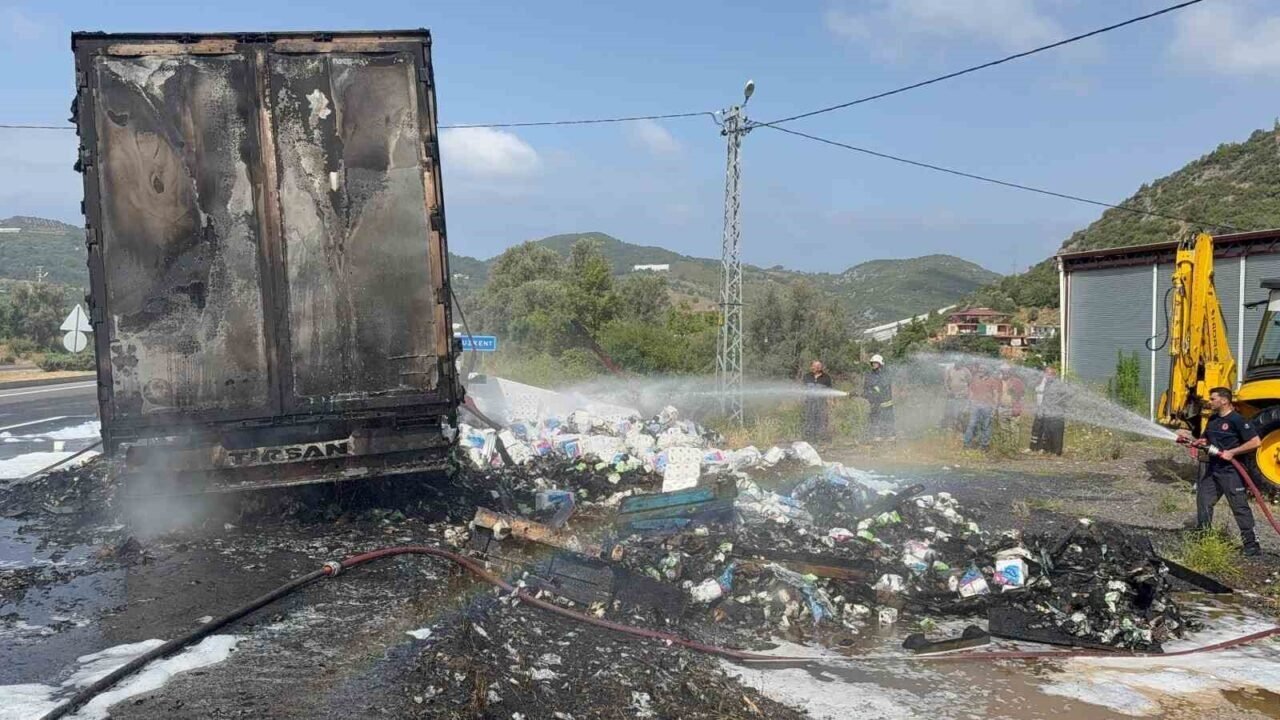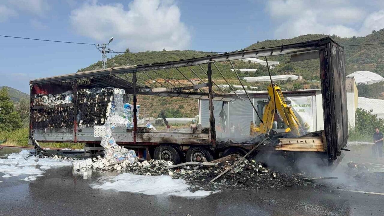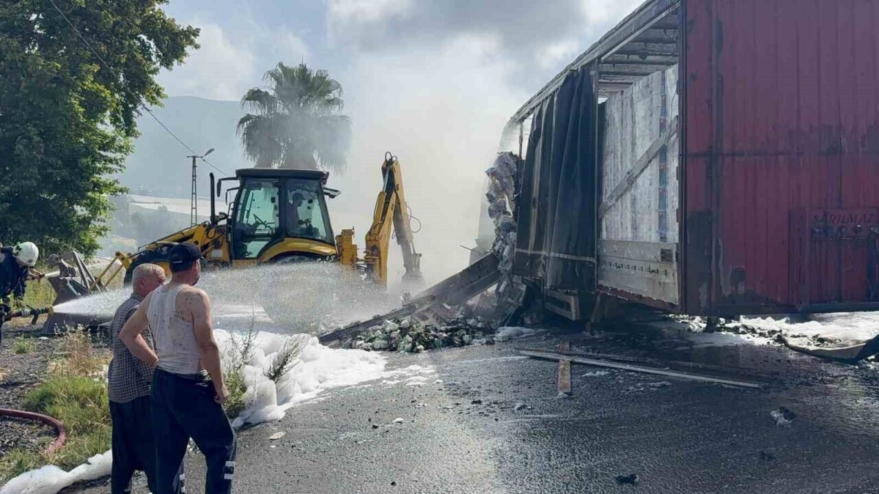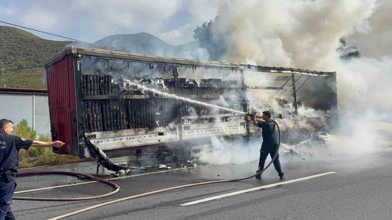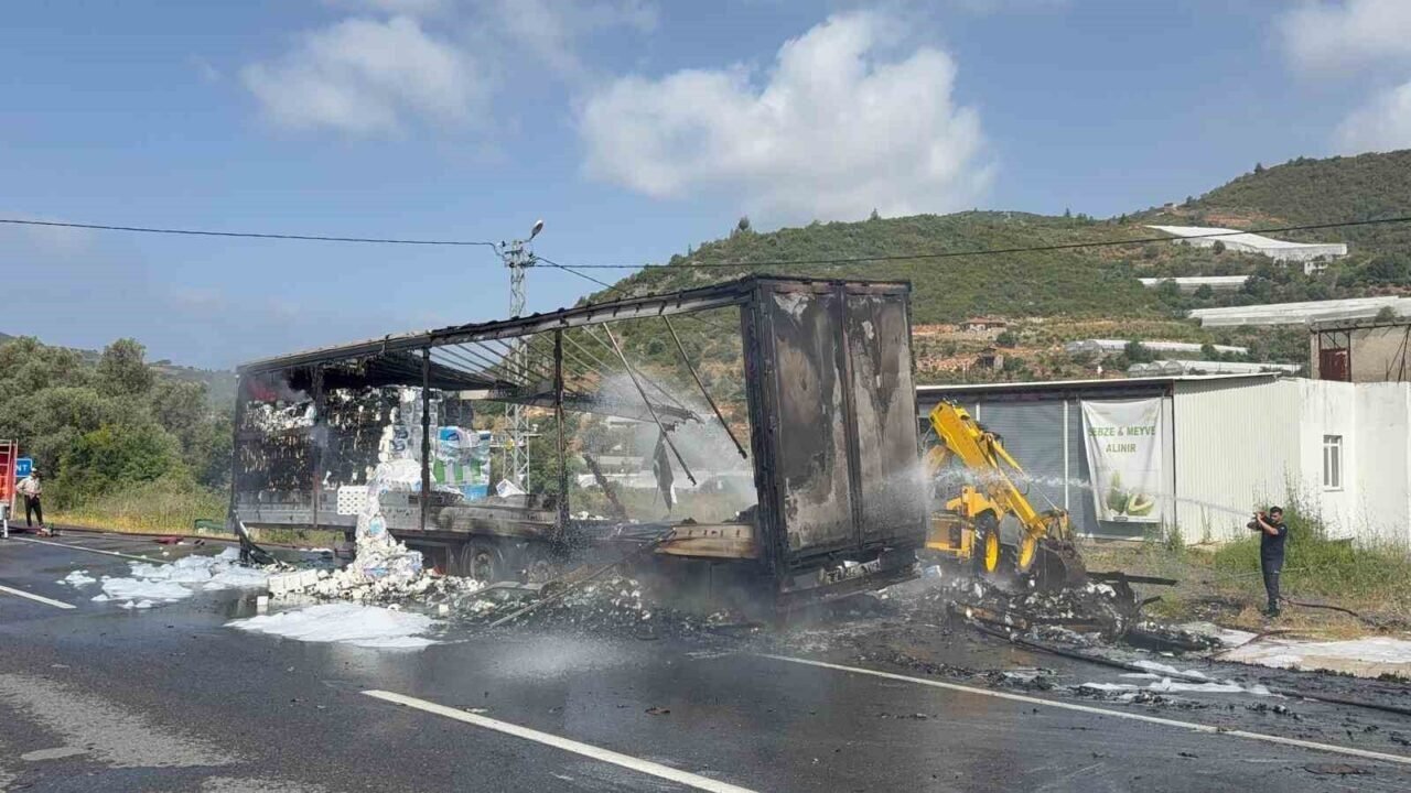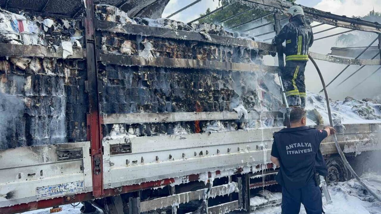 Antalya’nın Gazipaşa ilçesinde seyir halindeyken dumanlar çıkan peçete yüklü tırın dorsesi alevlere teslim oldu. Sürücünün soğukkanlı müdahalesi faciayı önledi.