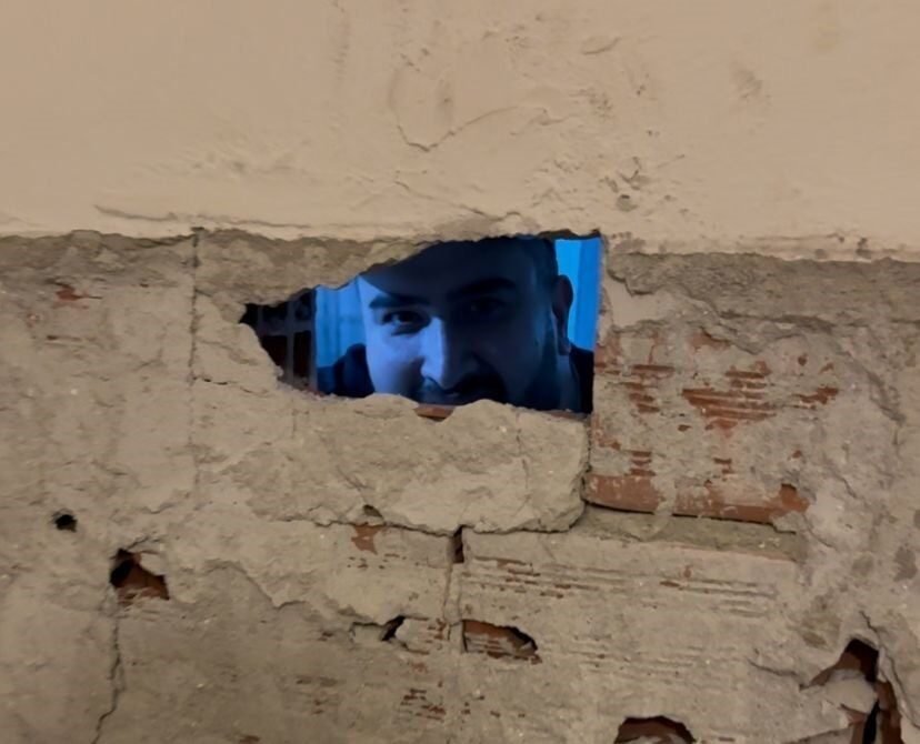İhlas Haber Ajansı (İHA) muhabirine olayı anlatan Kevrek, “Tesisat çalışması vardı yan dairede. Biz de uyarmak için ustanın yanına giderken duvardaki kırığı gördük. Ben de o anı videoya çektim. ‘Usta, sen bizim eve girmişsin’ gibisinden. Usta da normal bir şeymiş gibi karşıladı, ben de o an güldüm” dedi.