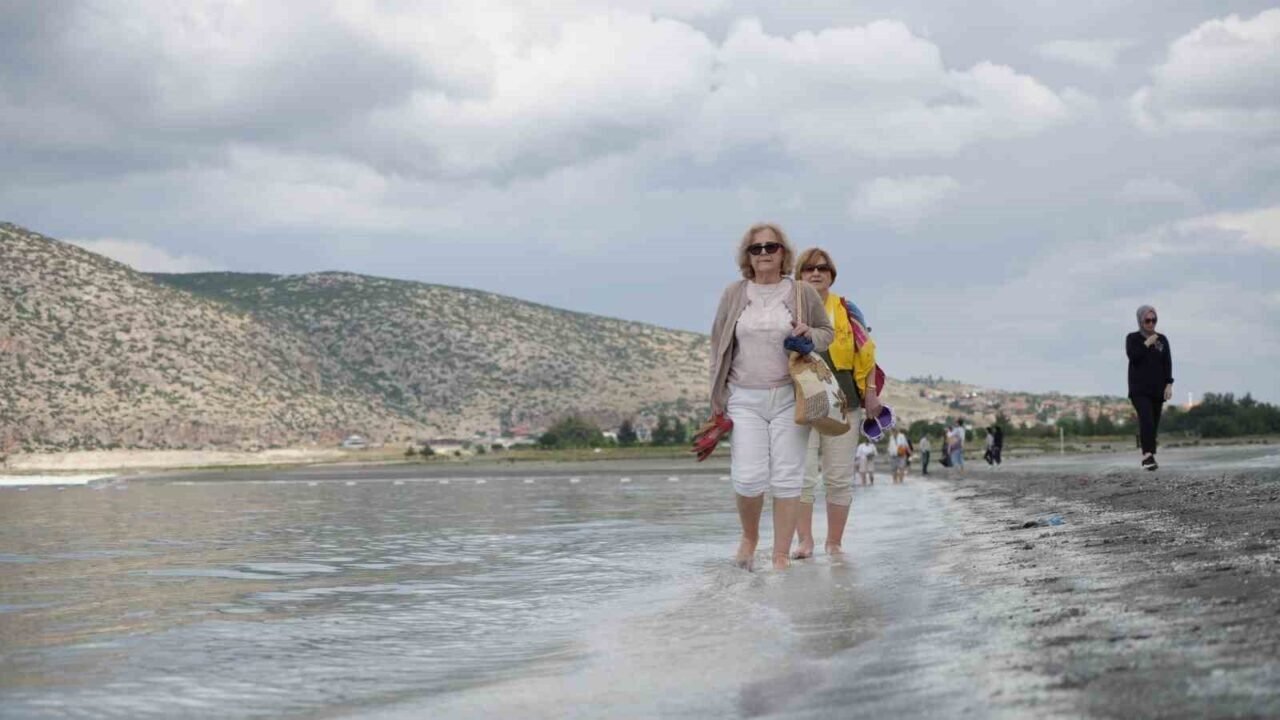 SALDA GÖLÜ’NDE AYAKLARINI SUYA SOKAN YABANCI TURİSTLER