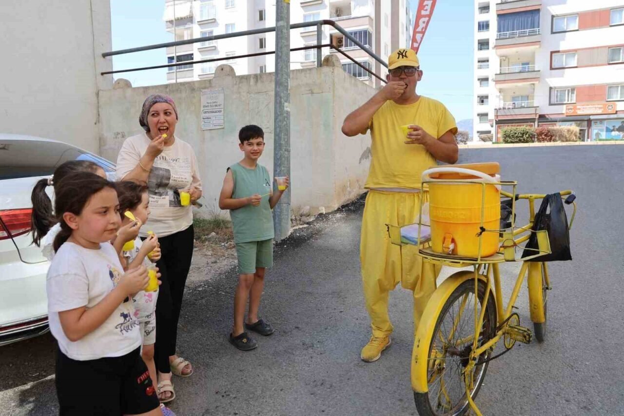 Adana’nın Kozan ilçesinde yaşayan Mehmet İldeniz, 46 derece sıcakta sarı şalvarı, sarıya boyalı bisikleti ve termosuyla ilçenin meşhur limon dondurmasını satıyor.