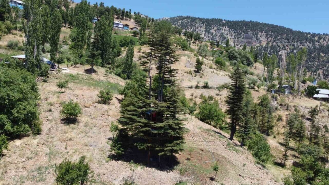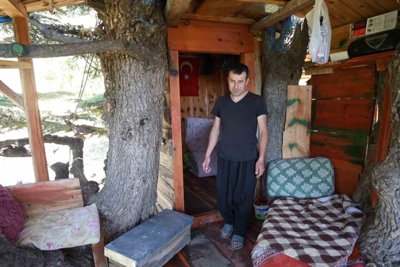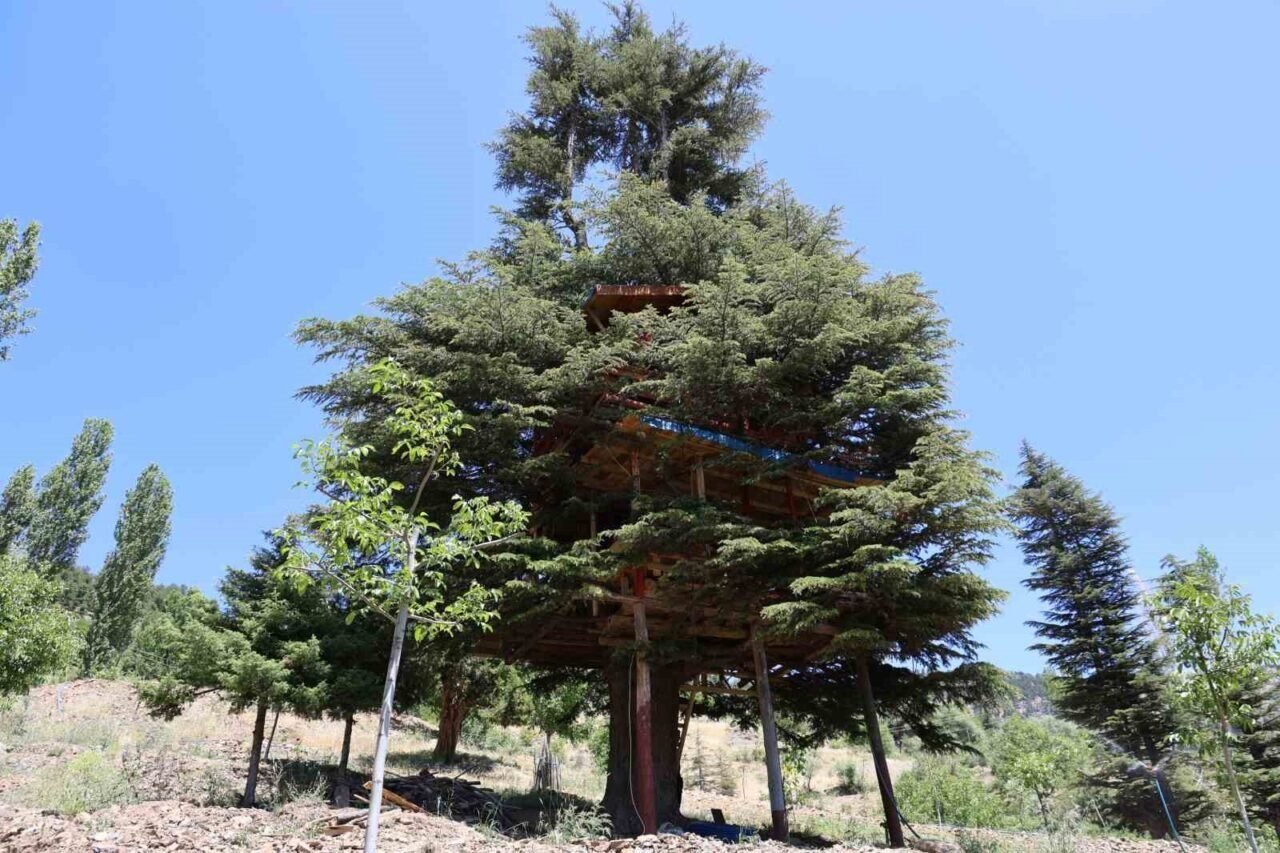 Adana’nın Saimbeyli ilçesinde yaşayan Bayram ailesi, bahçelerinde bulunan asırlık sedir ağacına tek bir çivi dahi çakmadan 2 katlı bir ağaç ev inşa etti.