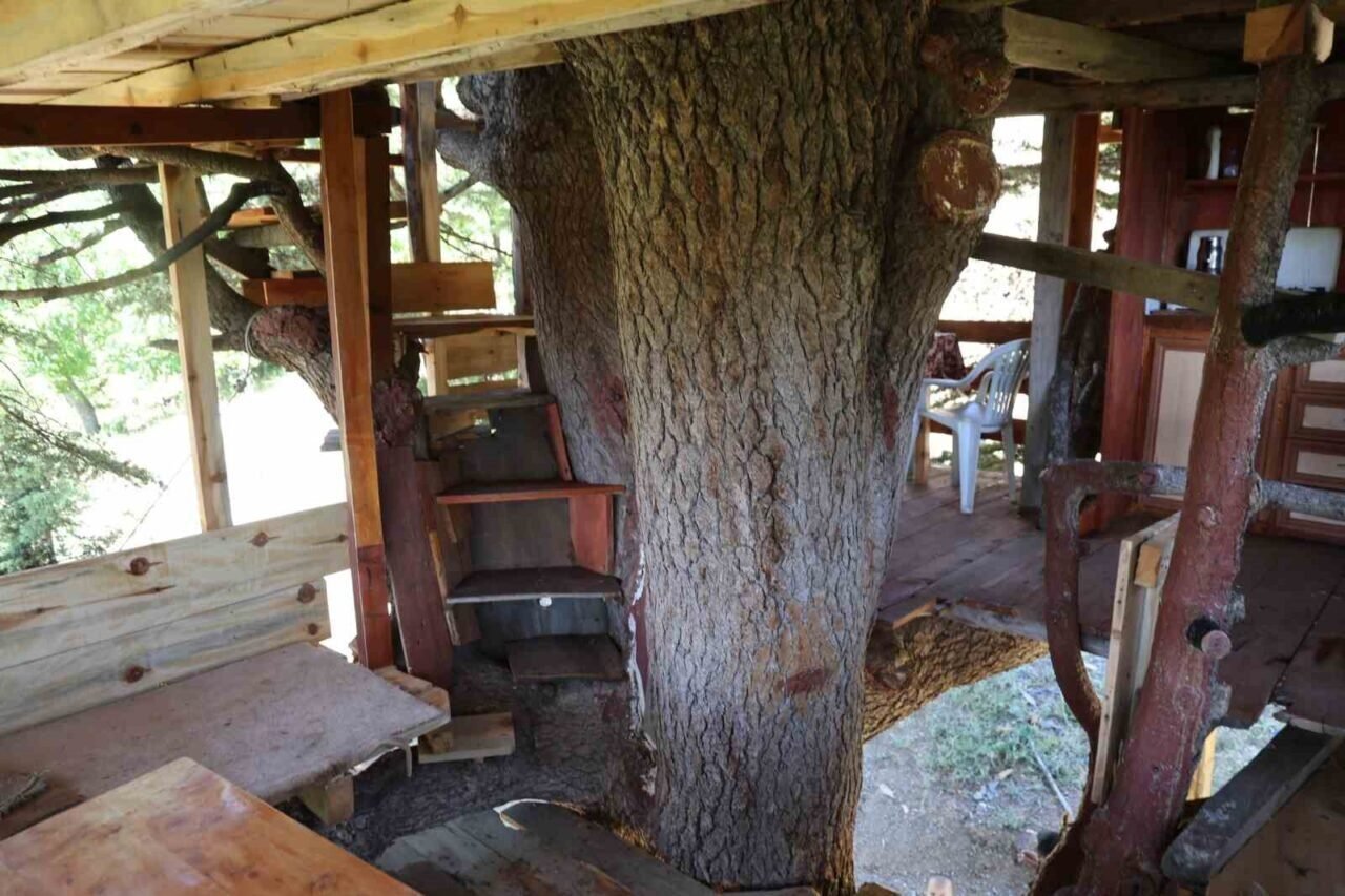 Sedir ağacı ve dalları arasına özenle hazırlanan iki katlı ev havadan görüntülendi.
