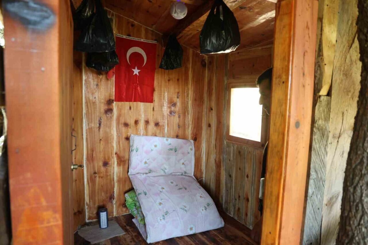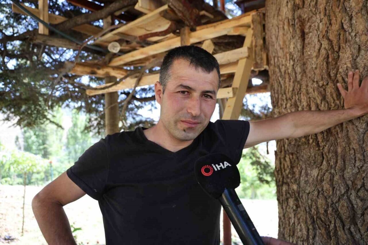 5 kardeşiyle tek bir çivi bile çakmadan bahçelerindeki Sedir ağacına evi tasarladıklarını belirten Musa Bayram; “Bu ağaca biz asırlık diyoruz ama yaşı daha fazla. 15 sene uğraştık yaptık. Şu an çalışmamız bitti. Çevresine ceviz ağaçları diktik. Ağaçta çivi yok. Dallarına ağaçları inşa ettik ve yıkılmaması için ağaç altlarından direklerle destekledik. Herkes gelip görebilir. Çok gelen var görenler hayran kalıyor. Burada kalmak isteyen var kiralamak isteyen var. Görenler çok beğeniyor. Arılar kendi doğal yuva yaptı arıların keyfi yerinde ellemiyoruz. Onlar kendi ormanında bizlerde ayrı birbirimize zarar vermeden yaşıyoruz. Serin oluyor ve çok keyifli oluyor” dedi.
