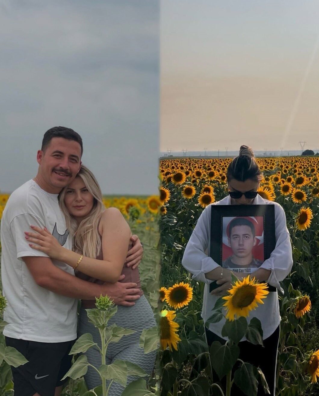 Tunceli’de kazada şehit olan polis memuru Yiğit Can Yiğit’in eşi İlknur Yiğit, onunla birlikte fotoğraf çektirdiği ayçiçek tarlasına gidip kucağında şehit eşinin fotoğrafı ile çekim yapması duygulandırdı.