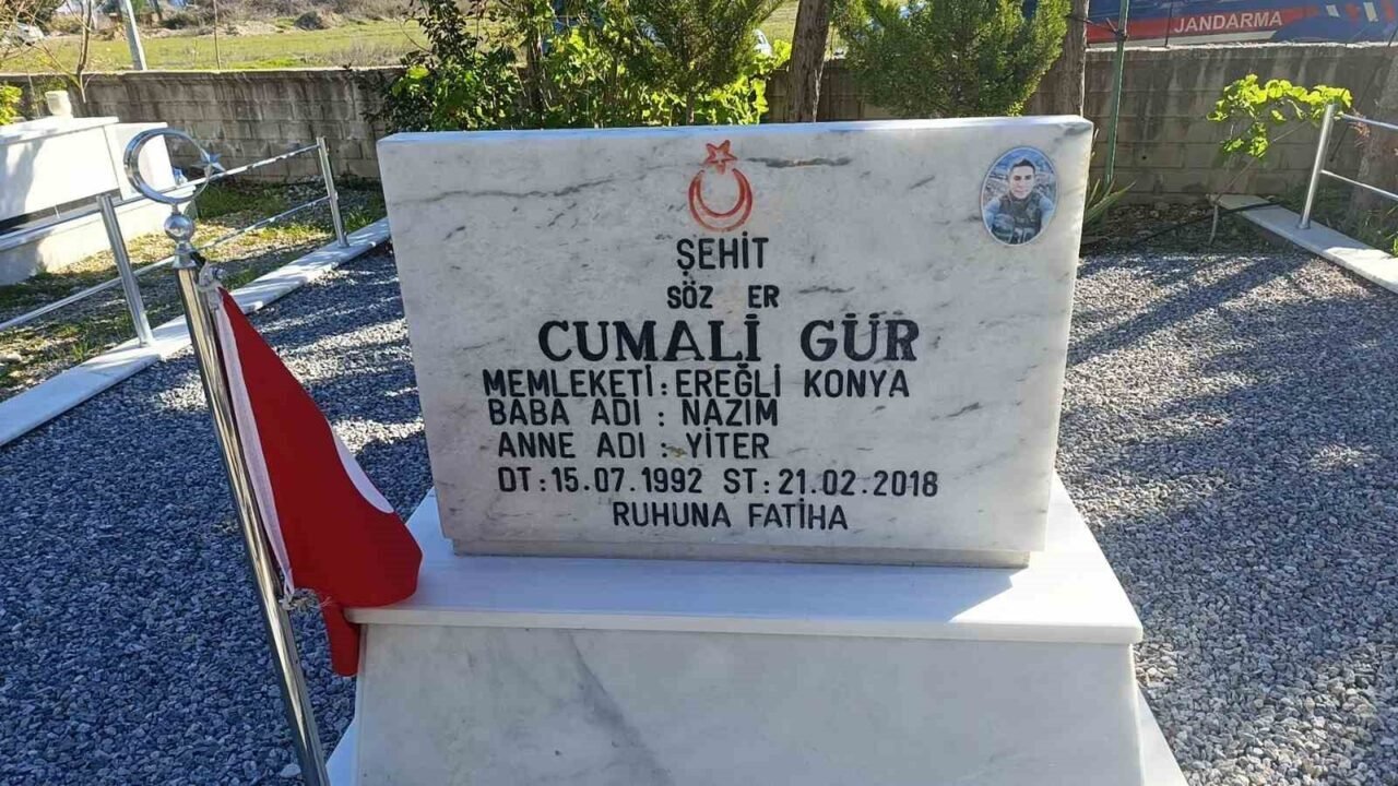 Irak’ın kuzeyindeki Kanireş bölgesinde 21 Şubat 2018 tarihinde şehit olan Sözleşmeli Piyade Er Cumali Gür, şehadetinin 7. yılında Manavgat’ın Kızılot Mezarlığı’ndaki kabri başında dualarla anıldı. Duygu dolu anlara sahne olan anma törenine şehidin ailesi, jandarma personeli ve öğrenciler katıldı.