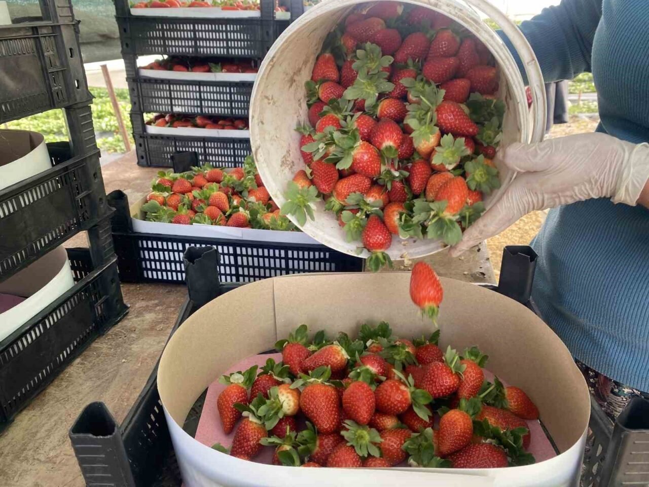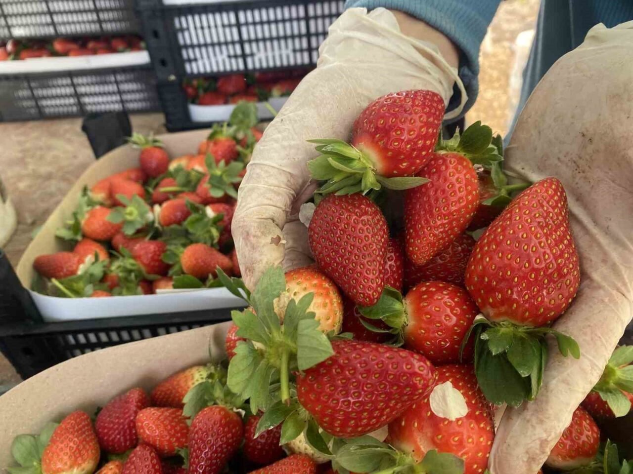 Yaklaşık 1 ay önce kilogramı 300-400 TL arasında satılan çilek, serada ortalama 90 TL’ye düşmüş durumda. Çilek üreticisi Emine Peker, Aralık ayında hasada başladıklarını ve başlangıçta kilosunu 400 TL’ye sattıkları çileklerinin, bir ay içinde 90 TL’ye kadar düştüğünü söyledi. Peker, 10 dekar alanda çilek yetiştirdiğini belirterek, “Bir ay önce 400 TL’den çilek sattık. Bu sene rakamlar bu şekilde giderse en azından emeklerimizin karşılığını alırız diye sevindik. Ancak fiyatlar hızla düşerek 250 TL’ye indi. Şu an ise 90-100 TL civarında satıyoruz. Haftada iki defa hasat yapıyoruz ve her hasat yaklaşık 600 kilo civarında oluyor” dedi.
