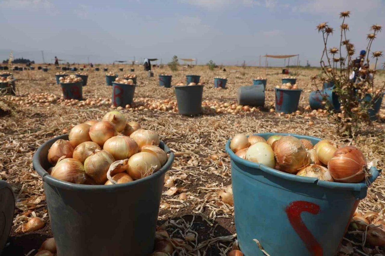 Hatay’ın Amik Ovası’nda 40 dereceyi bulan aşırı sıcakta zorlu şartlarda hasat edilen soğanın tarla fiyatı 5 TL’ye düştü.