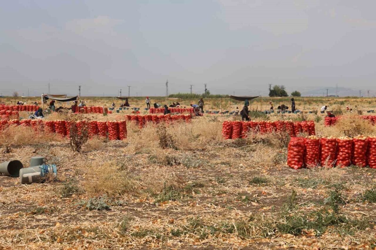 Sıcaklıkların 40 dereceyi geçtiği Amik Ovası’nda soğan hasadı devam ediyor