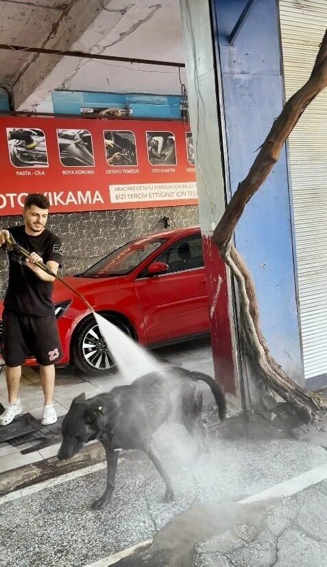 Antalya’da sıcaklardan bunalan bir köpek, sanayideki oto yıkamacıya gelip her iki saatte bir serinliyor. Çalışanların araçları yıkadıkları sırada köpeği de üzerine su tutarak serinlettiği anlar, izleyenleri tebessüm ettiriyor.
