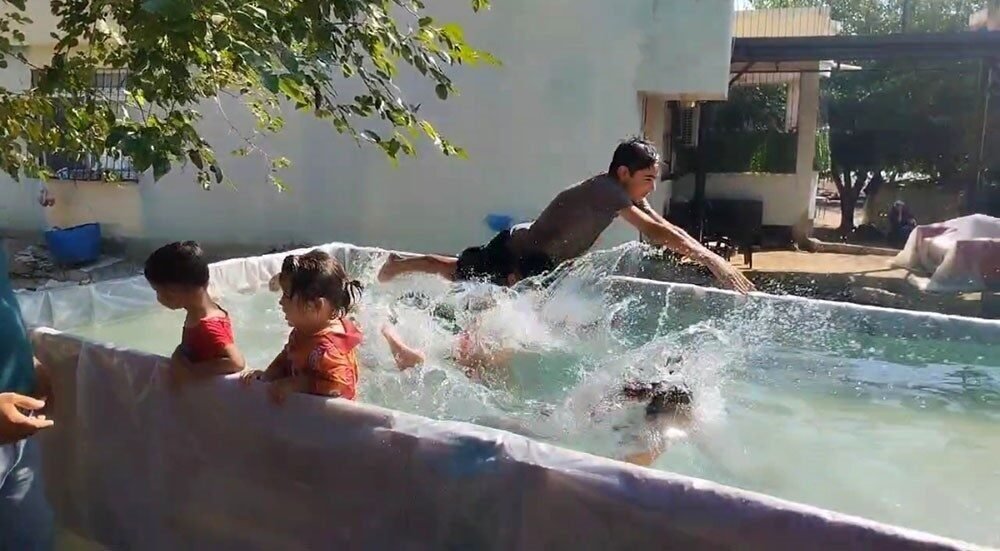 Adana’nın Yumurtalık ilçesinde aşırı sıcaklar nedeniyle deniz de çok ısınınca bir vatandaş çocuklarına traktör römorkunda havuz yaptı. Çocuklar gün boyu havuzda yüzdü.